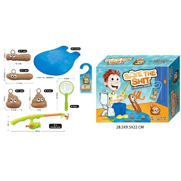Весела дитяча гра "Save the shit". У комплекті є: вудочка, 4 купки-какашки з очима, мережа. Головна мета гри, використовуючи всю свою спритність, зловити всі купки на гачок. Гра весела і точно сподобається діткам. Виконана з якісного та безпечного матеріалу, для дітей від 3-х років.