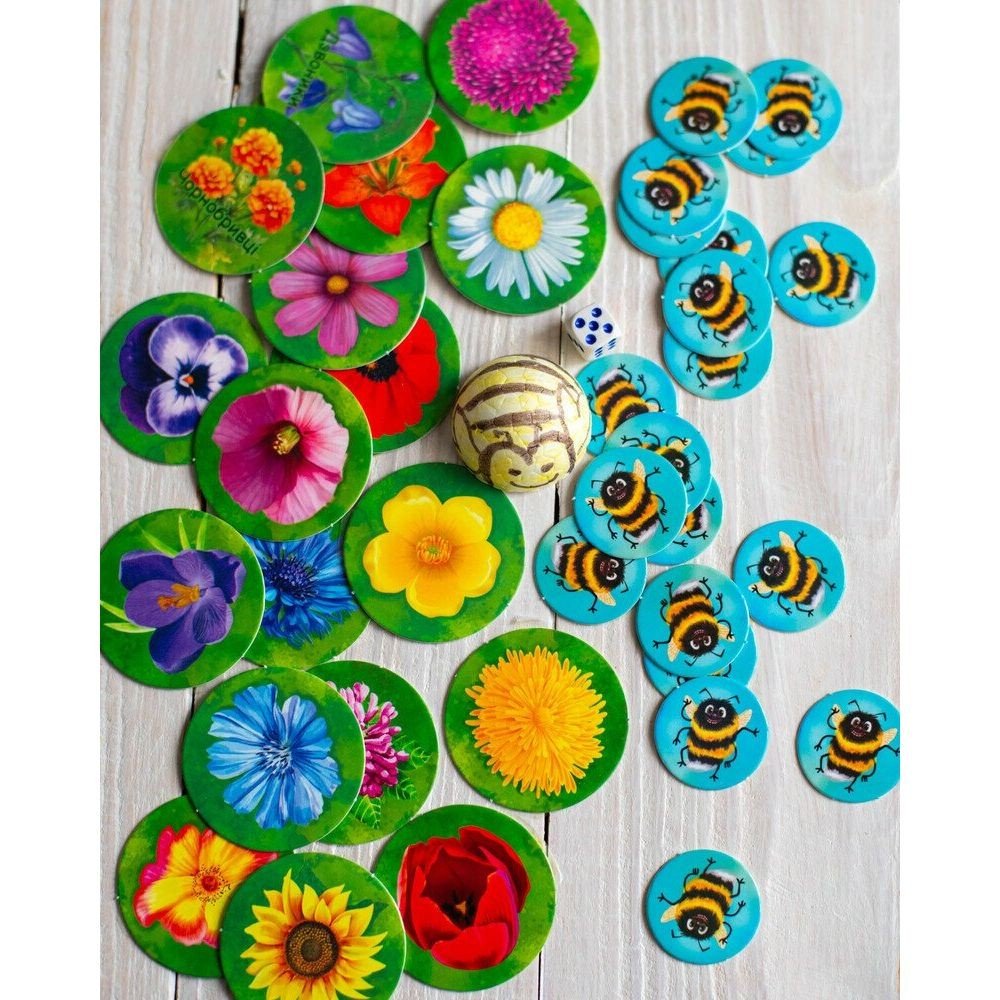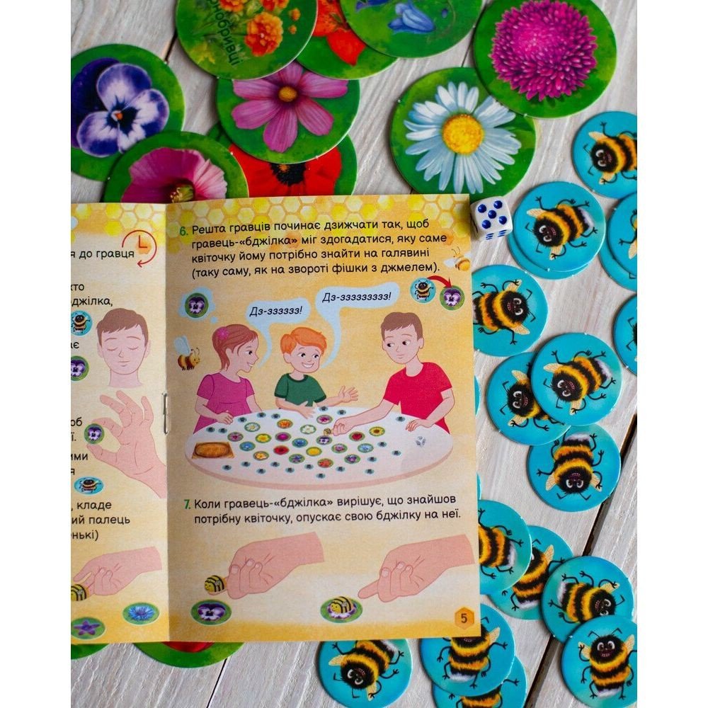 Бренд: Ранок Мова: Українська Упаковка: Коробка Колір: Різнобарв'я Вага з упаковкою: 102 г Габарити в упаковці: 3 x 11 x 15 см Країна виробник: Україна Матеріал: Комбінований Комплектація: Велику бджілку (для великих пальчиків), маленьку бджілку (для маленьких пальчиків), 20 великих фішок, 20 маленьких фішок, бджолине гніздо, кубик, правила гри