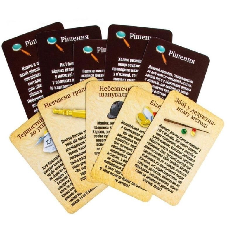 Під час цієї захопливої гри учасники долучаються до розкриття найцікавіших справ з детективної практики Шерлока Холмса. Ведучий зачитує короткий опис справи. Завдання гравців - за допомогою запитань якомога точніше встановити причину події, що відбулася. Гра розрахована на 2-6 гравців віком від 12-ти років.