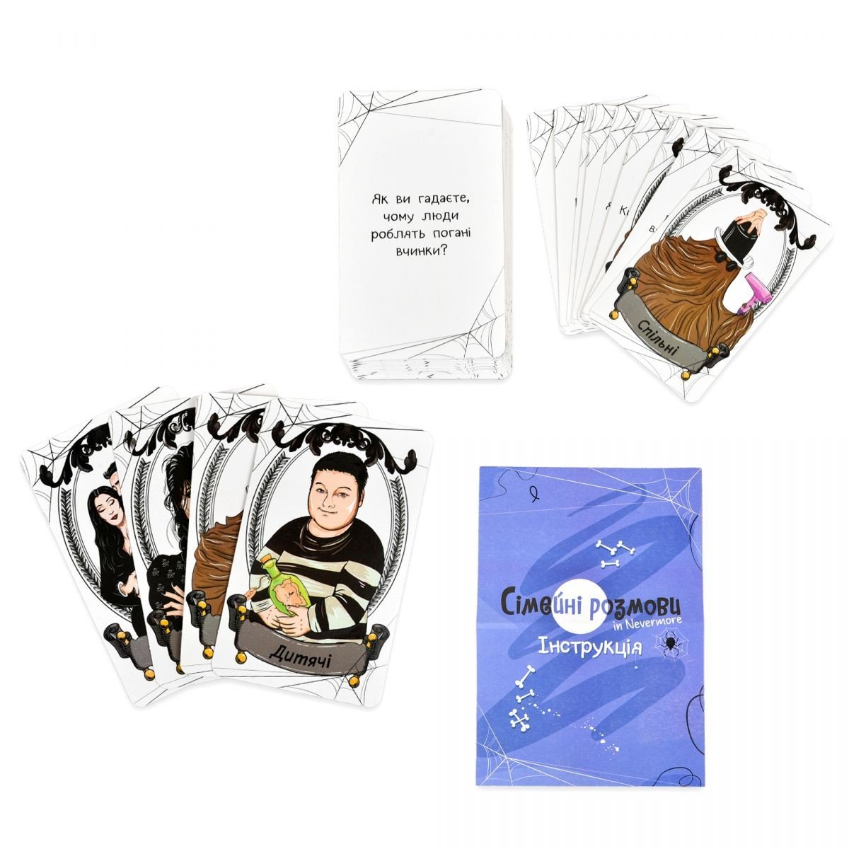 Сімейні розмови - настільна гра, яка зближує родину, допомагає краще зрозуміти одне одного та весело провести час разом. У комплекті картки, розділені на три категорії: "Для батьків" - запитання, які ставлять батьки; Для дітей - запитання від дітей до дорослих; Для всіх - картки з веселими завданнями та цікавими темами для всієї родини. Ця гра перетворить звичайний вечір на тепле сімейне спілкування, повне щирості, сміху та нових відкриттів.