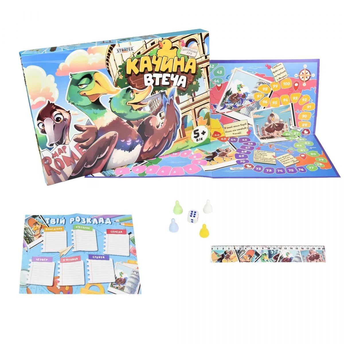 Просто кидай кубик та роби ту кількість кроків уперед, скільки випало на кубику. На шляхуподорожі ти також зустрінеш цікаві факти про різні точки світу, не забудь поділитися ними з друзями. Успіхів тобі та веселої качиної втечі! Комплектація: ігрове поле, фішки (4 штуки), кубик, розклад занять, лінійка.