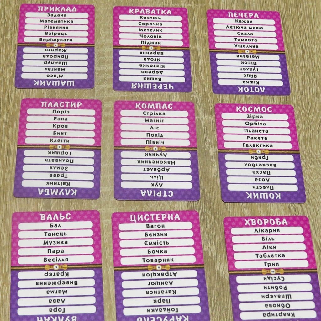 Цікава настільна гра. Суть гри: потрібно за 1 хвилину пояснити слово, яке зазначено на картці, не називаючи його, а так же, не називаючи ще 5 слів, які додатково вказані на цій же картці. У грі задіяно приблизно 512 різних слів. Розрахована на 4 -10 гравців від 9 років.