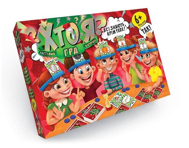 Настільна гра "Хто я?". Хід гри: кожному гравцеві на голову надівається обруч, в який вставлена картка з малюнком. Необхідно вгадати ким є інший учасник. Для цього можна задавати питання, на які може бути відповідь "Так" або "Ні". За кожне вгадати слово, гравець отримує бонусну фішку. У наборі: 162 картки зі словами, 6 додаткових карток з питаннями, 6 пластикових обручів, фішки, пісочний годинник.