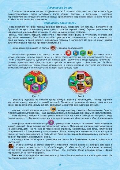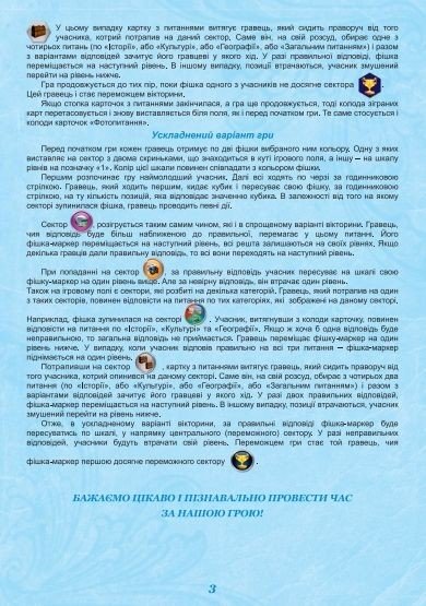 Бренд: Artos games Мова: Український Упаковка: Коробка Колір: Різнобарв'я Вага з упаковкою: 1030 г Габарити в упаковці: 32.5 x 7.5 x 32 см Габарити без упаковки: 33 x 8 x 32 см Країна виробник: Україна Матеріал: Комбінований Комплектація: Ігрове поле, 144 картки з питаннями, кубик, фішки (8 шт.)