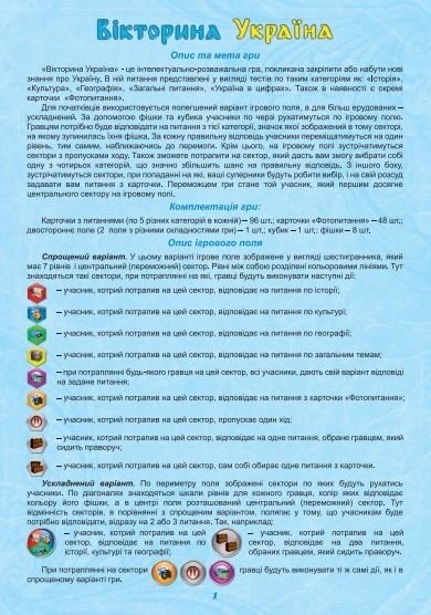 Настільна гра "Вікторина Україна". У грі 2 варіанти ігрового поля (звичайний і ускладнений). Пересуваючись по полю, гравці відповідатимуть на питання різної тематики (історія, культура, географія, загальні питання, фотовопроси, Україна в цифрах). Правильно відповівши на питання, гравець просувається на одну клітинку. Переможе той, хто перший дійде до фінішу.