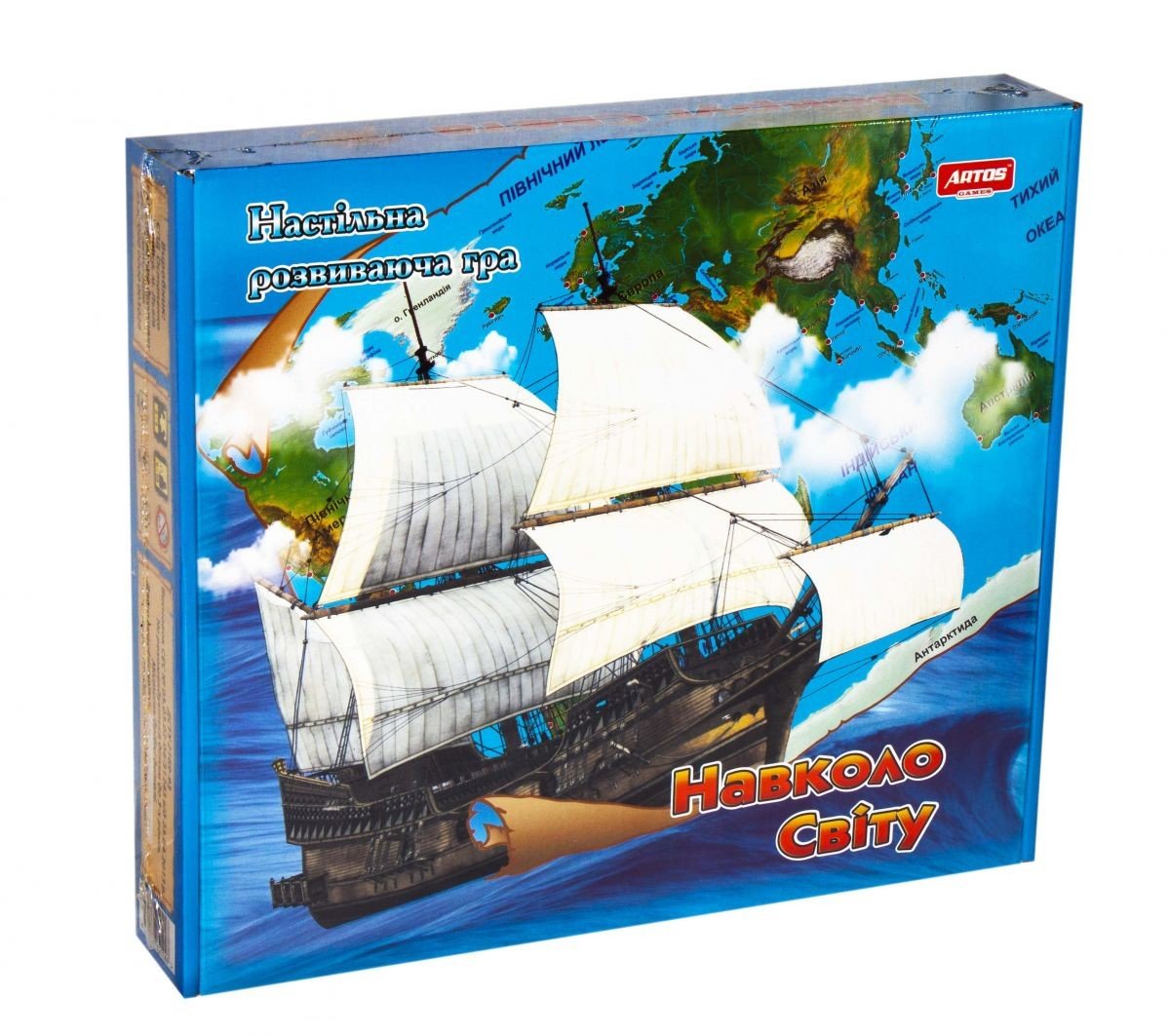 Настільна гра "Навколо світу". Учасники гри будуть проводити експедиції, при цьому рухаючись у випадковому (вибраному ним) напрямку, розрахувавши оптимальний маршрут. У комплекті: ігрове поле (укр. І рос. Мовою), картки вантажу (по 32 картки на 2-х мовах), картки експедиції (по 4), призові жетони (по 60 шт.), Рулетка вітрів, гральні фішки (4 шт.), кубик, правила гри.