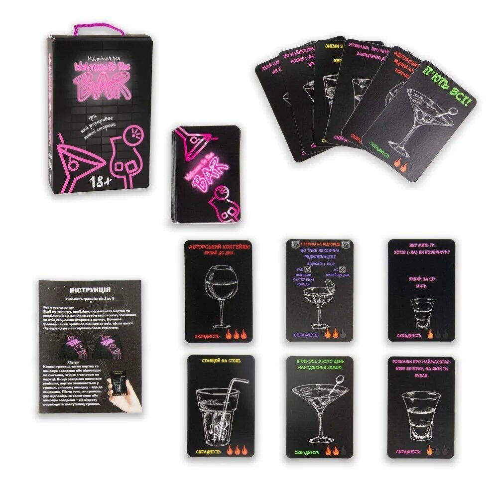 "Welcome to the BAR" - це настільна гра для двох гравців або компанії. У ній ви отримаєте справжню насолоду від атмосфери гри. Гравці тягнуть картки та виконують різні завдання або відповідають на цікаві питання. Якщо завдання виконане - картка залишається у гравця, а якщо ні - йде у скид та хід переходить наступному учаснику. 110 карток.