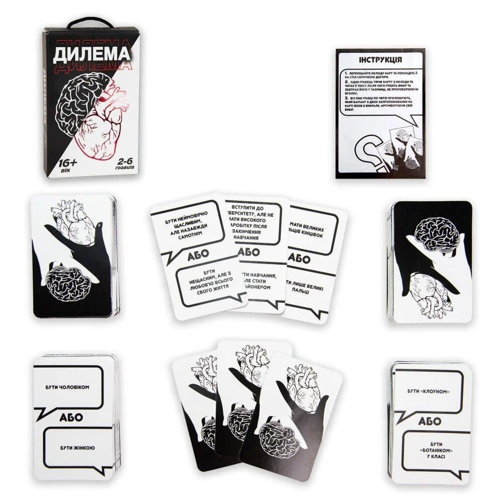 Гра "Дилема" - це цікавий та захоплюючий спосіб провести вечір, де ви можете обговорювати різні теми та ділитися своїми думками з друзями. У грі немає правильних відповідей - лише два варінти та ваш вибір миж ними. Ідеальна для будь-яких вечірок і посиденьок з друзями. 220 карток. Українською мовою.