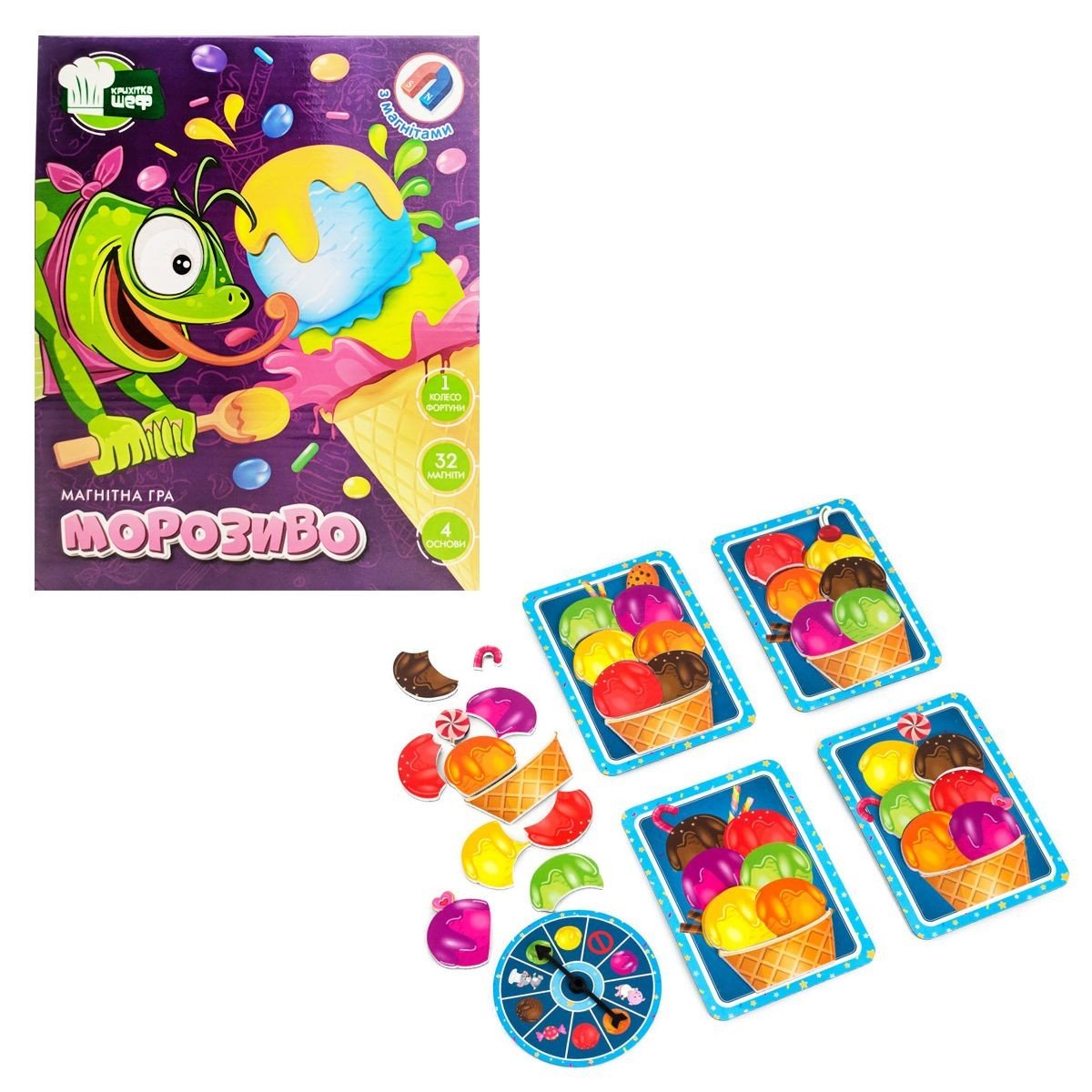 Настільна мгнітную гра "Морозиво". У грі можуть брати участь 2-4 гравця. Кожен гравець, по черзі, крутить колесо фортуни, і виконує дії, які вказані на колесі (вибирає той, чи інший кульку морозива, стаканчик). Переможе той, хто швидше збере морозиво. Для дітей від 3-х років.