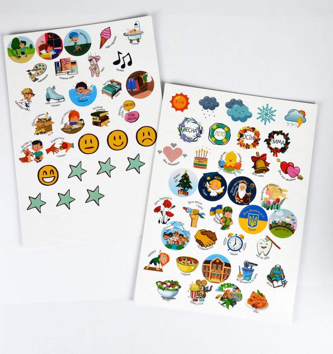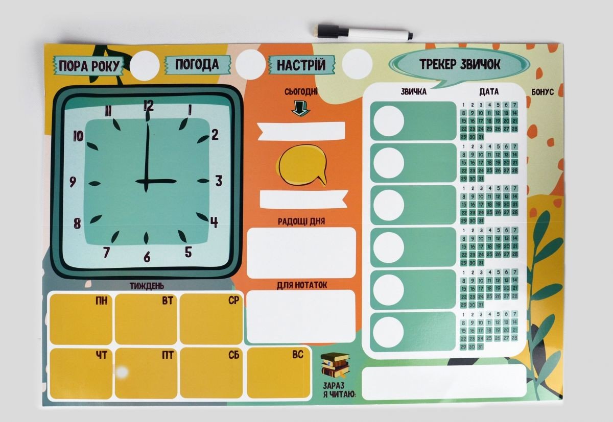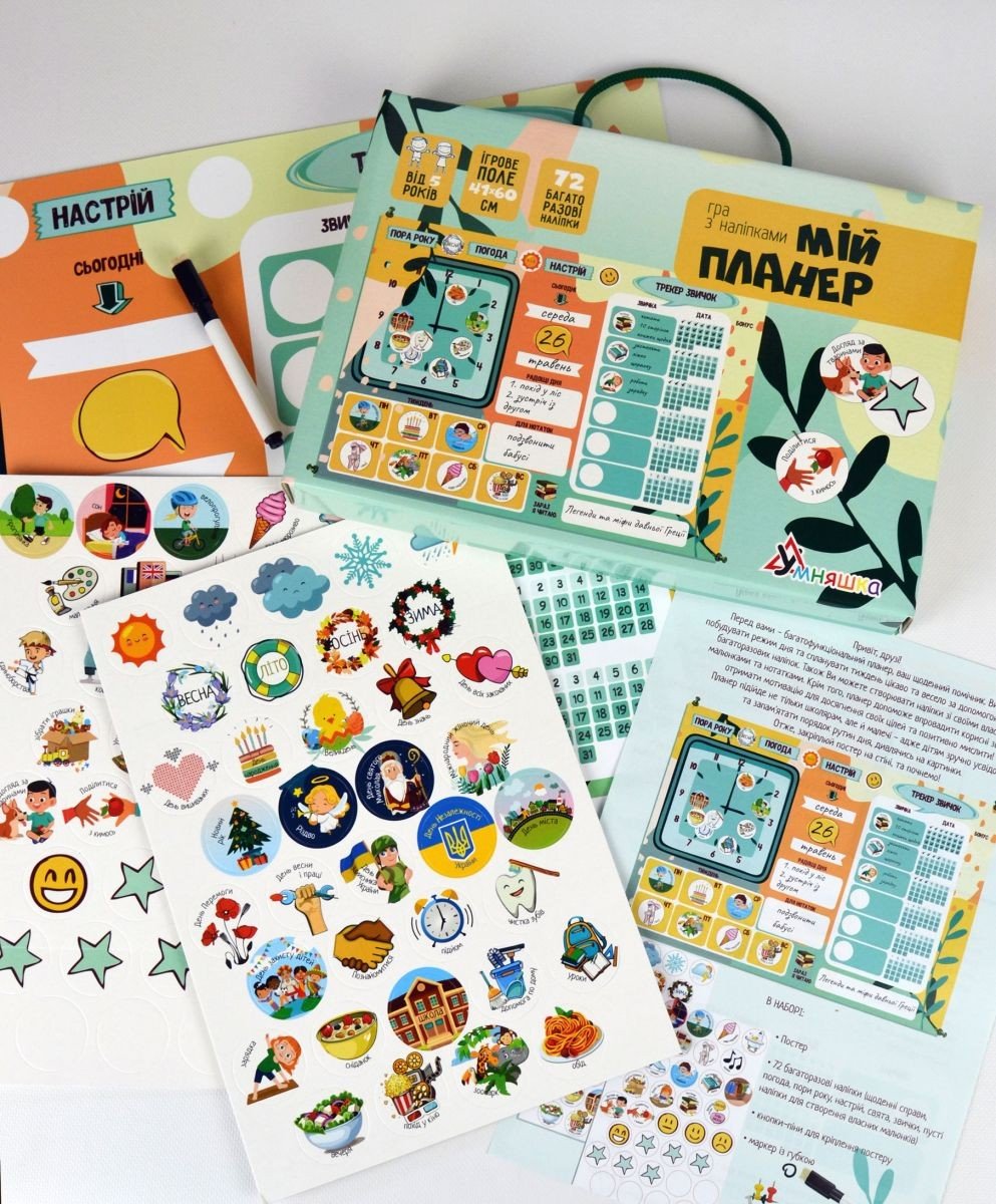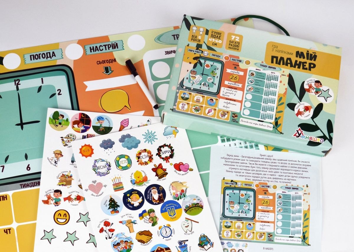 У комплекті є 72 багаторазові наклейки (щоденні справи, погода, пори року, настрій та багато іншого), кнопки для кріплення постера, великий постер розміром 40х60 см. Призначено для дітей віком від 5 років.