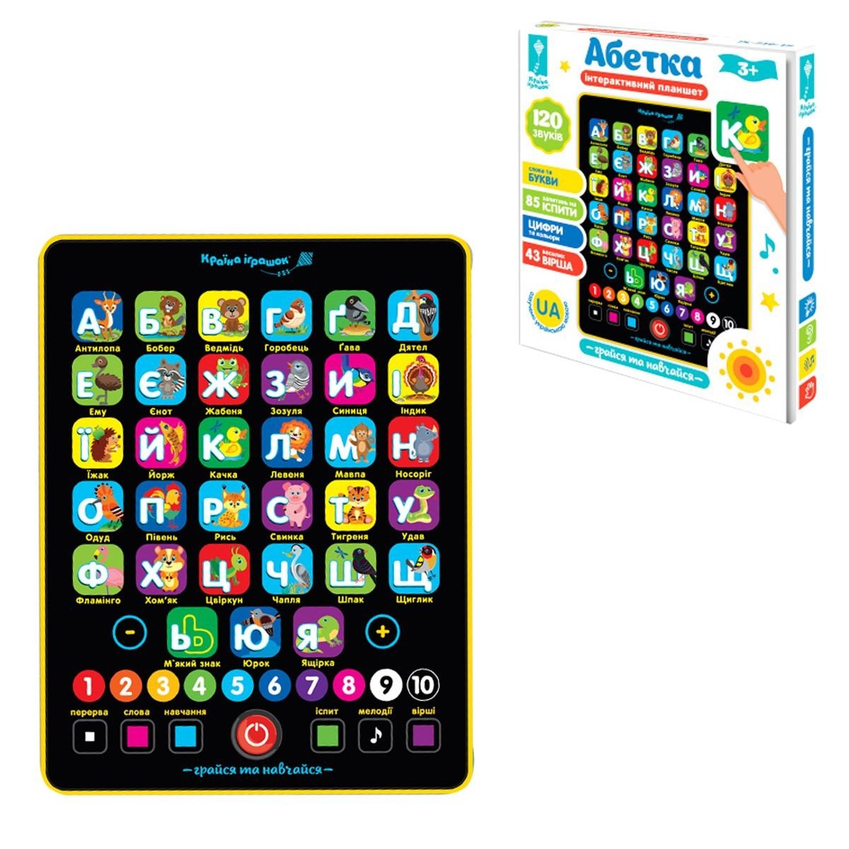 Бренд: Країна іграшок Мова: Український Упаковка: Коробка Колір: Жовто-чорний Тип ел-тів живлення: Батарейки (ААА) Кількість ел-тів живлення: 3 Ел-ти живлення в комплекті: Ні Вага з упаковкою: 355 г Габарити в упаковці: 30 x 26 x 3.5 см Габарити без упаковки: 24 x 18.5 x 1.5 см Країна виробник: Китай Матеріал: Пластик Комплектація: Планшет