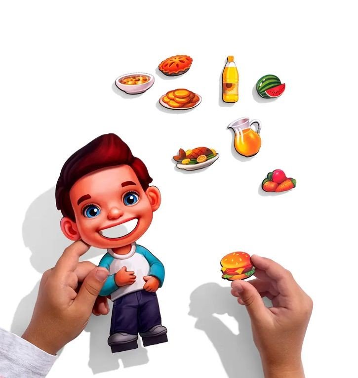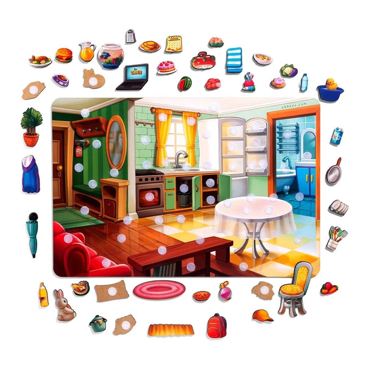 Гра складається з основи-планшета з малюнком кімнат в будинку і деталей, які кріпляться до основи на липучка. Потрібно навести порядок у кімнати і прикріпити усі предмети на свої місця, а потім ще погодувати малюка( хлопчик на підставці), пограти в "їстівне/не їстівне" (плашки треба просовувати йому до рота.