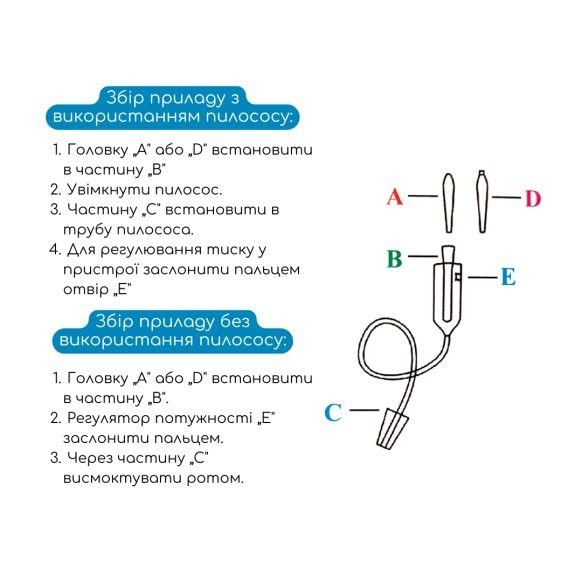 Бренд: Mega Zayka Мова: Українська Упаковка: Коробка Колір: Різнобарв'я Вага з упаковкою: 93 г Габарити в упаковці: 19.5 x 10 x 4 см Країна виробник: Україна Матеріал: Пластик Комплектація: Аспіратор, 2 насадки.