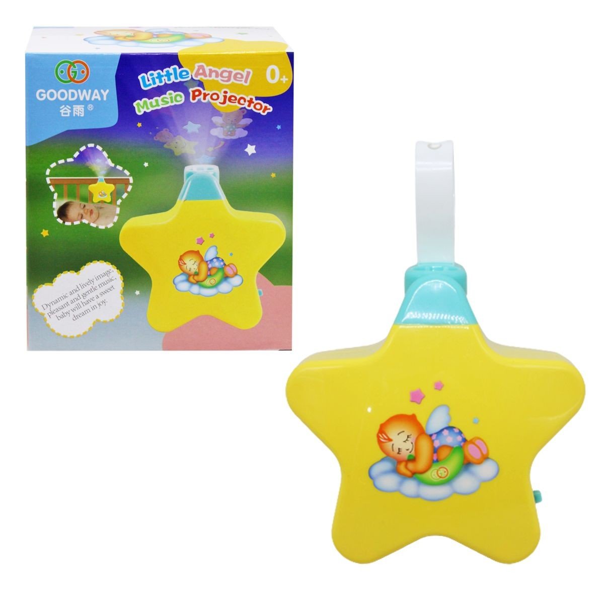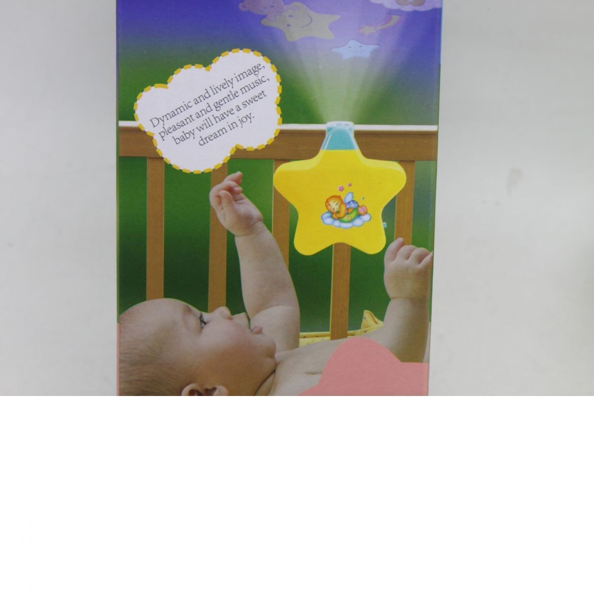 Кріпиться на ліжечко. Вбудована колискова, що грає на двох рівнях гучності, заспокоює малюка і допомагає йому легко засинати. Проектор створює на стелі зображення, що змінюються, додаючи в кімнату елемент магії. Цей нічник-проектор не тільки функціональний, а й стимулює розвиток візуальних навичок у вашого малюка. Працює від 3-х батарейок АА (немає в комплекті).