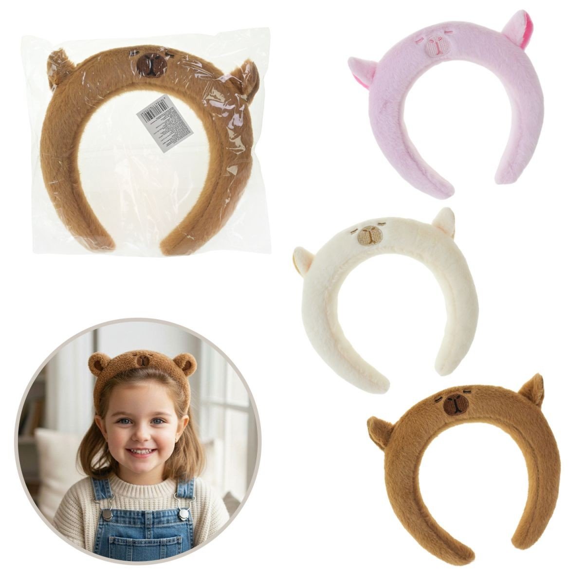 Гарненький та мʼякий обруч з вушками й мордочкою капібари. Досить легкий, еластичкий та приємний на дотик, він чудово підійде для вмивання чи просто, як декоративний аксесуар. Діаметр обруча - 11,5 см (всередині). В рамках артикулу представлений у кількох кольорових варіаціях. Виконано з якісних та безпечних матеріалів. Для дітей старше 3-х років.