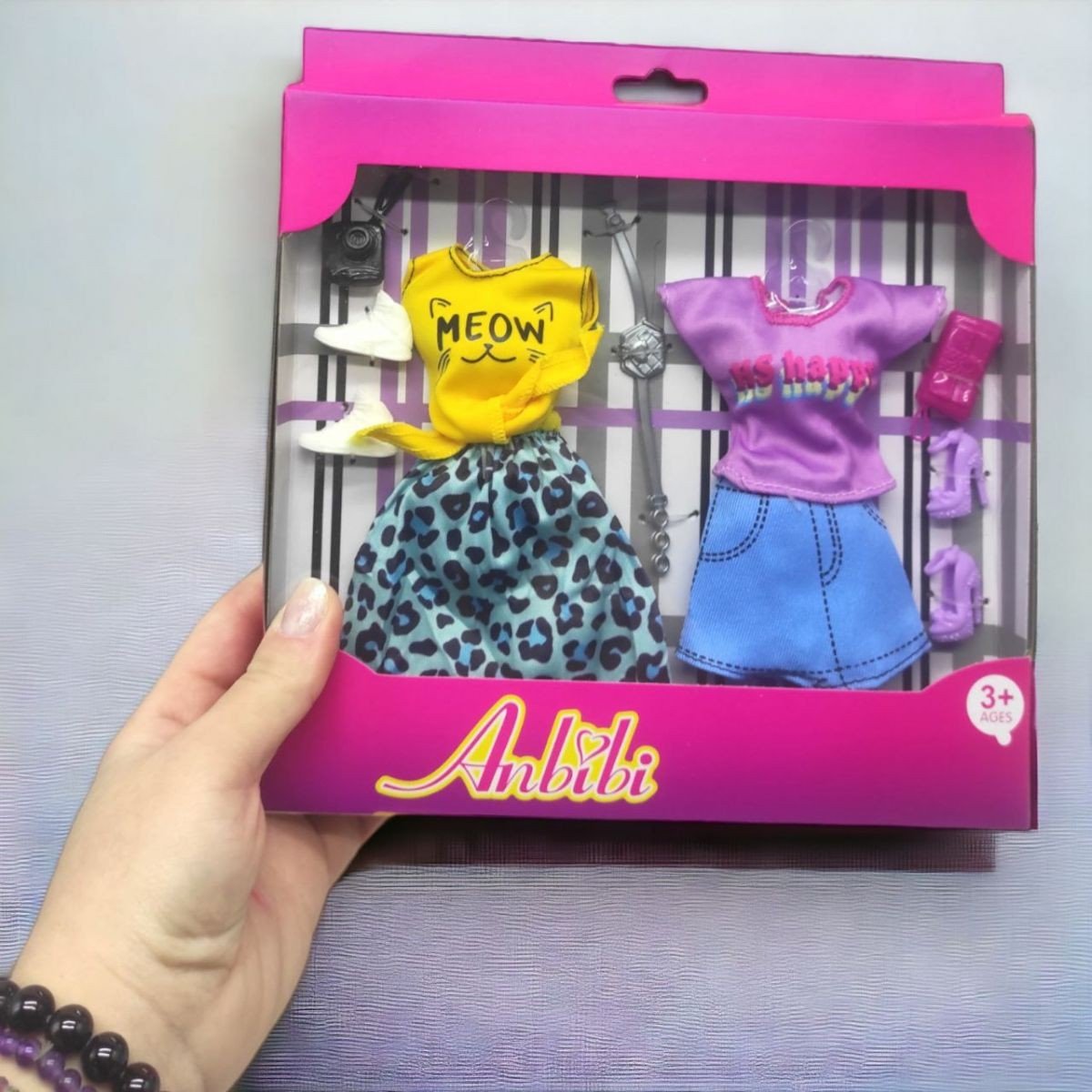 Бренд: MIC Упаковка: Коробка Колір: Різнобарв'я Вага з упаковкою: 100 г Габарити в упаковці: 2.5 x 22 x 20 см Габарити без упаковки: 1 x 12 x 7 см Країна виробник: Китай Матеріал: Текстиль Комплектація: 2 наряди, 2 пари туфель, 2 клатчі