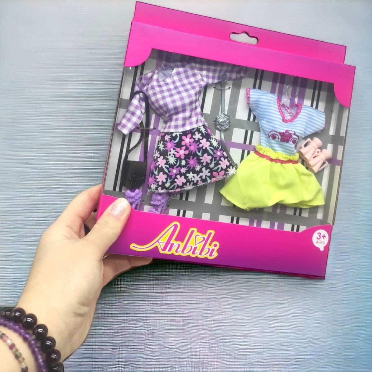 Набір із 2-х яскравих нарядів для лялечок стандартного розміру (заввишки 28 см). Наряди виконані з якісних матеріалів, мають міцні та надійні шви. Також в набір входить 2 пари туфель, 2 модні клатчі та ремінь. Набір обовʼязково сподобається маленьким модницям. Для дітей віком від 3-х років.