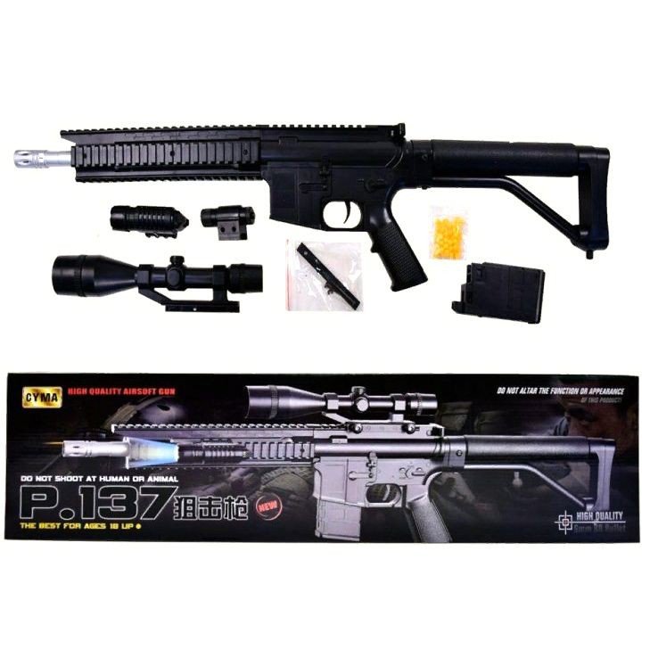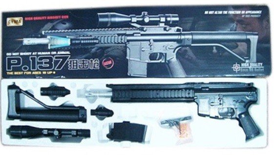 Автомат P137 на кульках. Дублікат реального автомата У коробці знаходиться в розібраному стані: автомат, ліхтарик, приціл, лазерний цілевказівник, магазин, додаткові кріплення та пластикові кульки. Для стрілянини потрібно натиснути кнопку біля магазину, зняти магазин, засипати кулі в нижню частину, потягнути пружину в магазині та встановити магазин на місце, потім натиснути курок. У магазині 130 кульок по 6мм. Виготовлений із якісного пластику. Заборонено стріляти по людях та тваринах.
