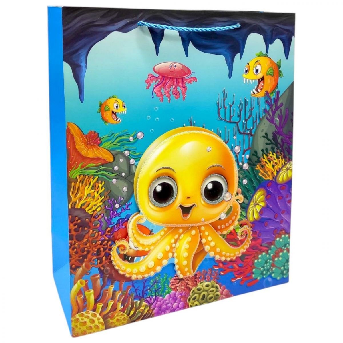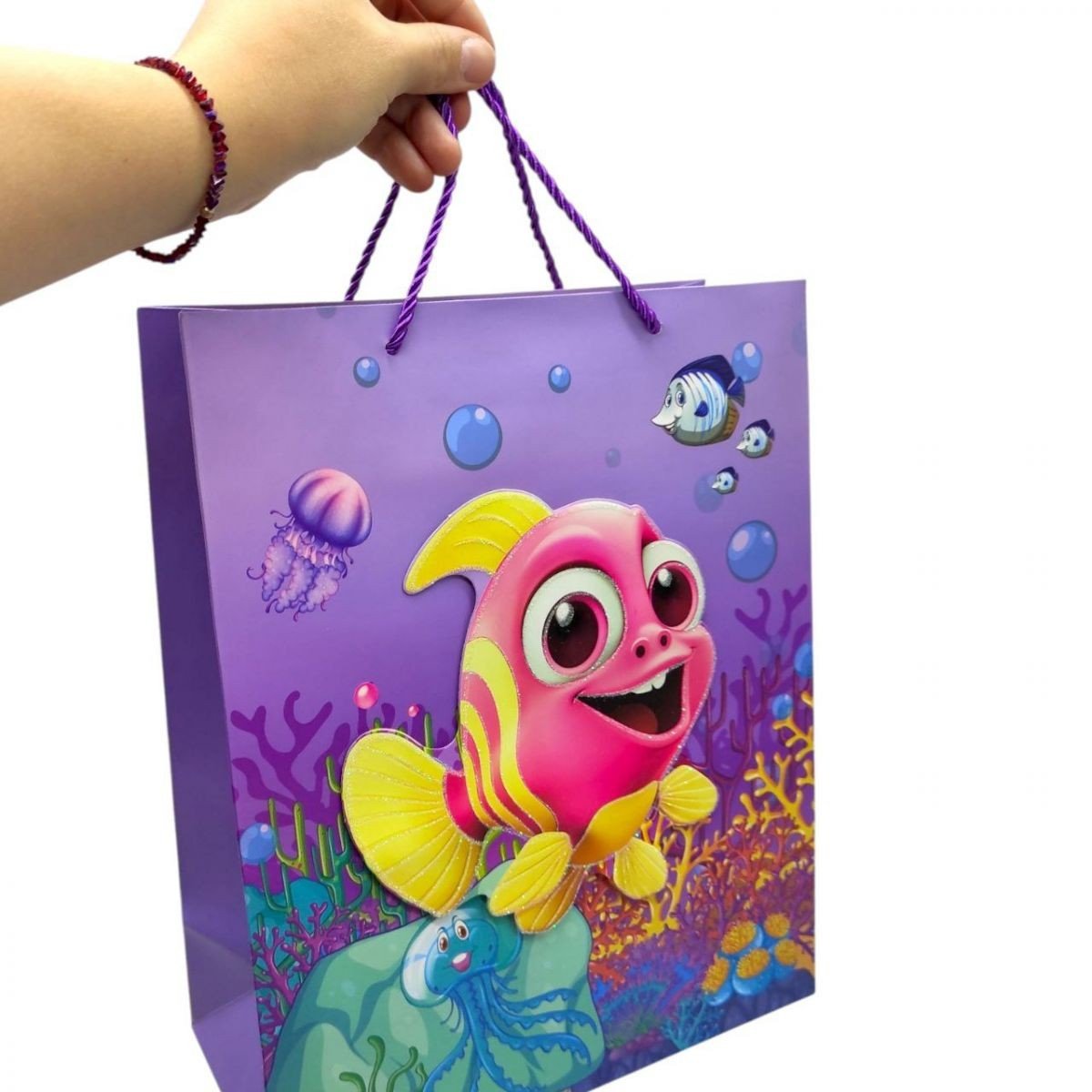 Яскравий подарунковий пакунок буде хорошим доповненням до основного подарунку та створить незабутній настрій свята. Пакет картонний, досить великого розміру: 32х26х12 см. Прикрашений красивим принтом. Має зручні та досить міцні ручки-мотузочки. Зробіть свій подарунок неперевершеним із цим чудовим пакетом.