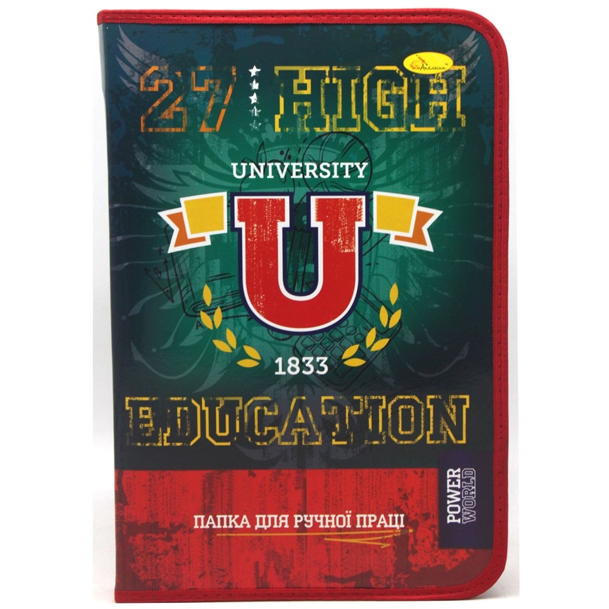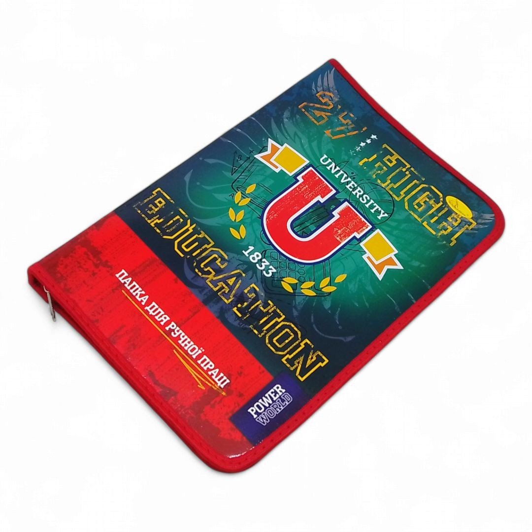 Велика папка на блискавці. Формат А4. Стінки виконані із щільного картону. На внутрішній частині є спеціальні кріплення резиночками для зошитів або канцелярського приладдя.