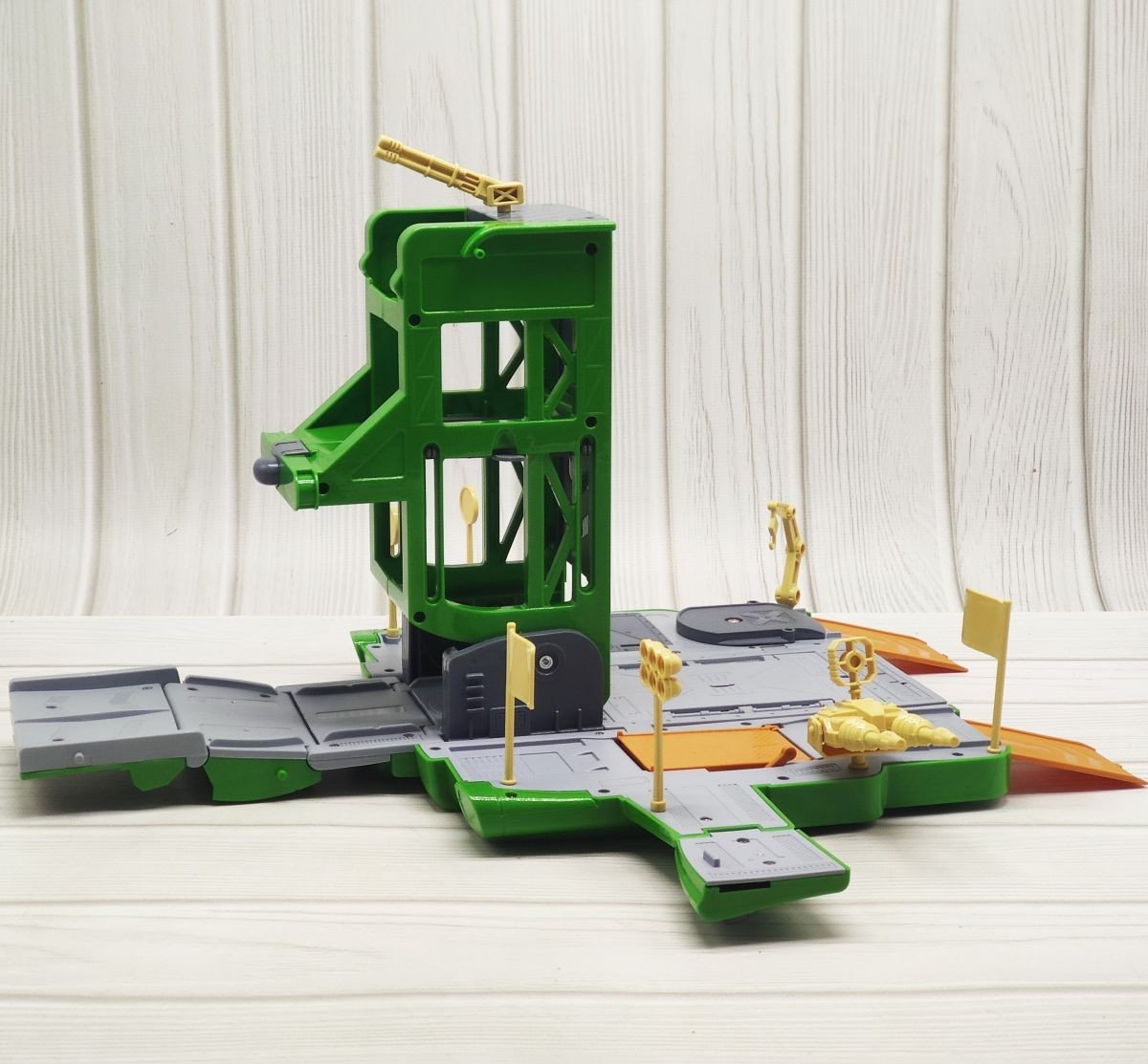 У складеному вигляді іграшка є машинкою (25х17х16 см), а розклавши стає незвичайною парковкою-треком. У такому вигляді має безліч ігрових функцій: парковка з механічним (піднімати вручну) ліфтом, підйомна платформа, платформа, що обертається, крутий трамплін. За допомогою спеціального лаунчера можна запускати машинки, Сам лаунчер оснащений світловими та звуковими ефектами. 2 металеві модельки, аксесуари та наклейки в комплекті.
