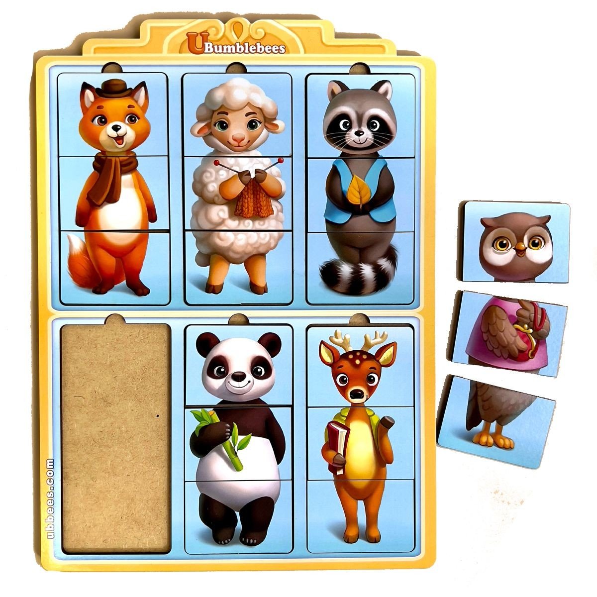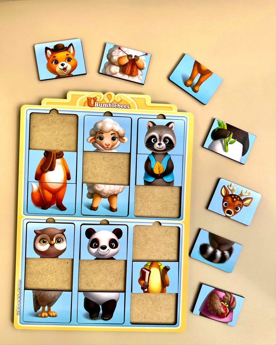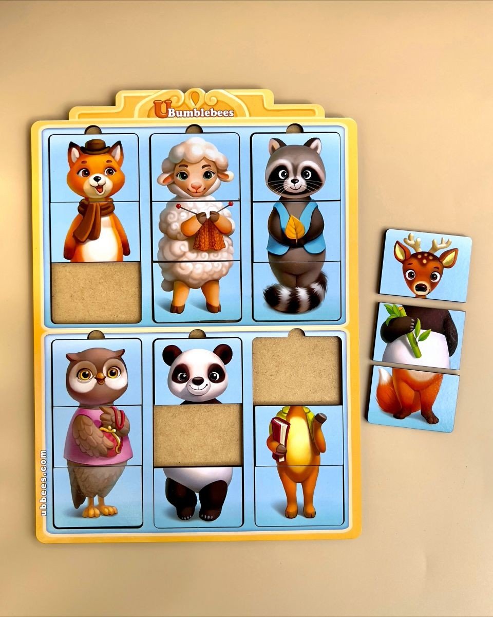 Розвиваюча гра з картинками тварин. Шість картинок-третинок тварин, які потрібно зібрати на планшеті. Потрібно підібрати дві правильні половинки картинки, щоб зібрати готову тварину, або поєднувати дві різні половинки, щоб створено щось нове. Гра - чудовий помічник у вивченні фігур, рахунки та кольорів.