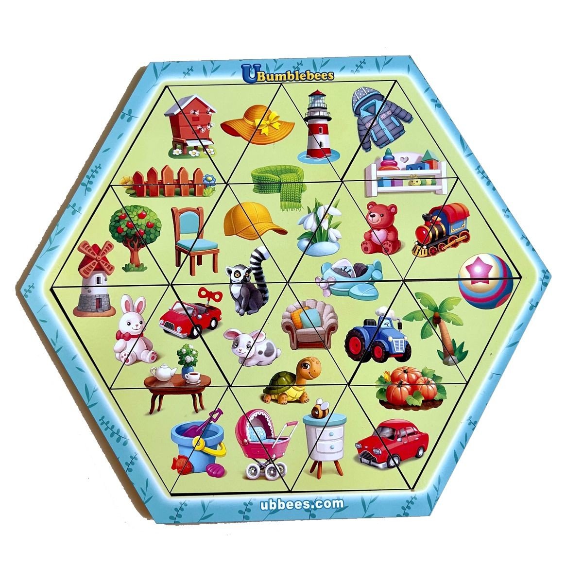 Деталі у вигляді трикутників. Потрібно зібрати пазл із усіх трикутників, на яких зображені половинки різних зображень. Можна вважати готові картинки, вивчати кольори та нові предмети.