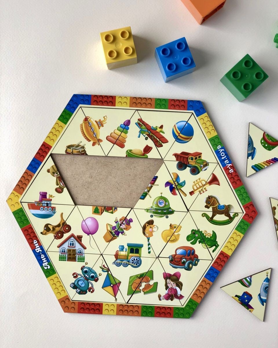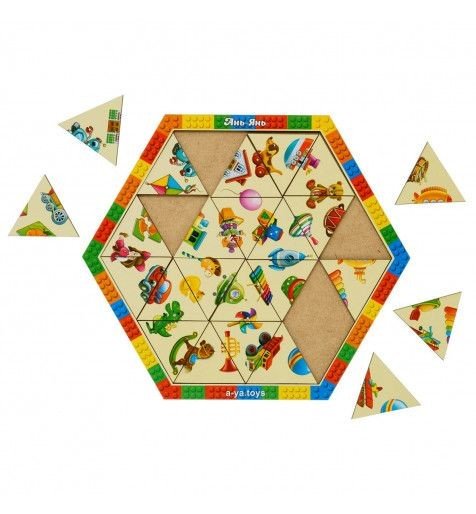 Пазл-головоломка з деталями у вигляді трикутників, а сама основа (рамка) - це шестигранник. Потрібно зібрати пазл з усіх трикутників так, щоб вийшла картинка. Розмір рамки - 26,5х23 см.