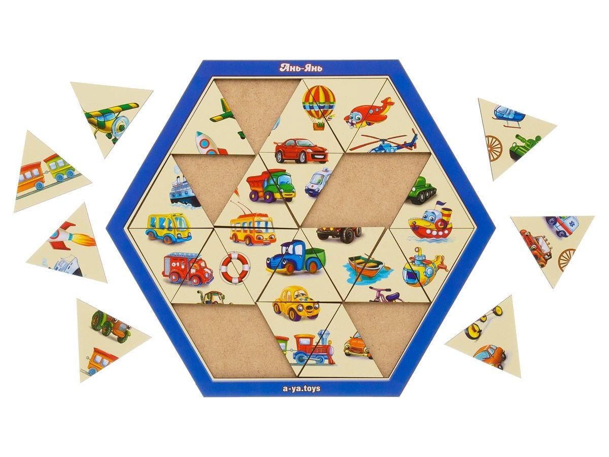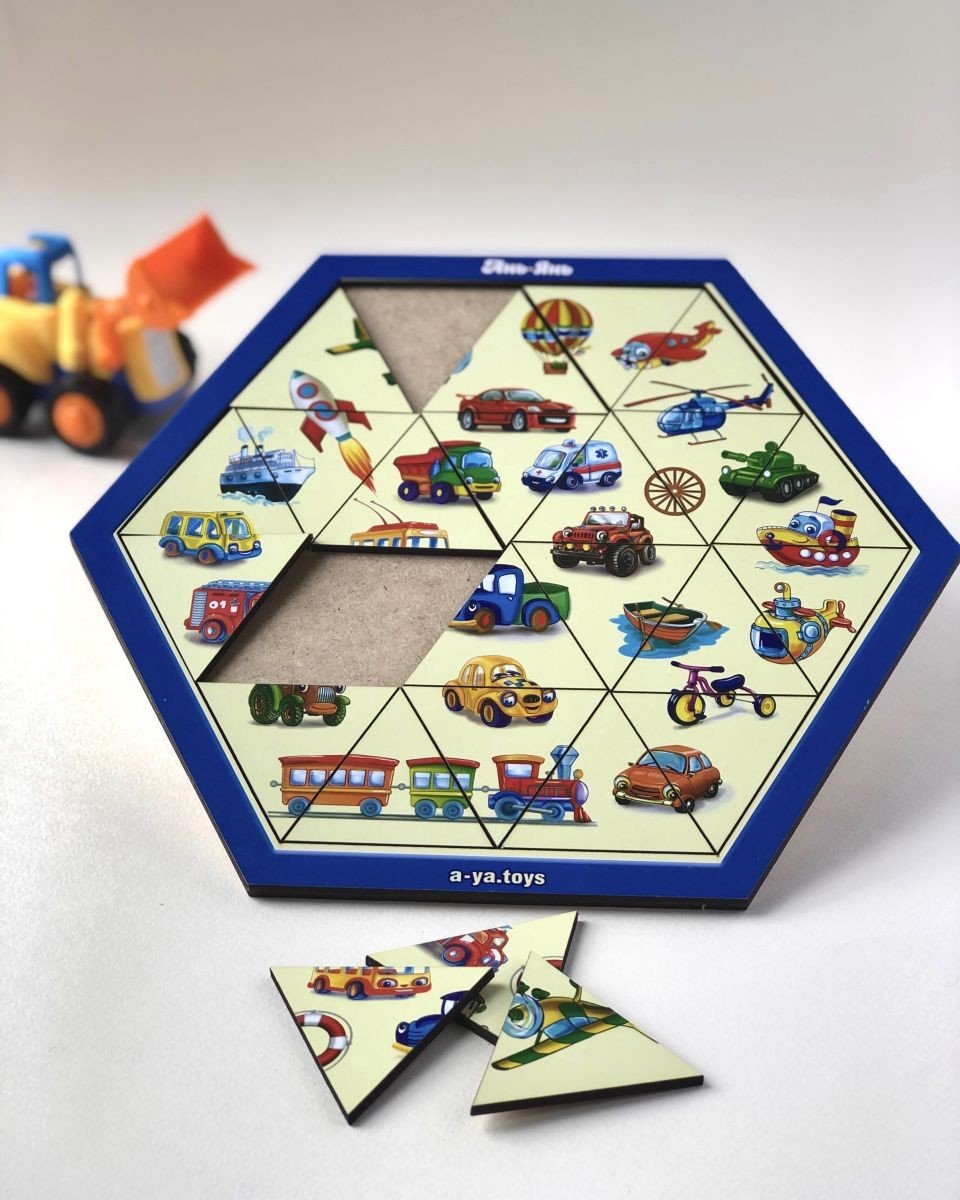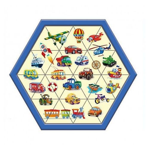 Пазл-головоломка з деталями у вигляді трикутників, а сама основа (рамка) - це шестигранник. Потрібно зібрати пазл з усіх трикутників так, щоб вийшла картинка. Розмір рамки - 26,5х23 см.