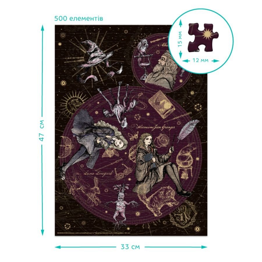 Пазл на 500 елементів для дітей віком від 8 років і старше. З героями всесвіту "Гаррі Поттер". Цей яскравий і барвистий пазл є цікавим і корисним заняттям, що сприяє розвитку логічного мислення, уваги і терпіння у дітей. Складання пазла допоможе їм розвивати моторику, візуальне сприйняття та покращувати навички вирішення завдань. Розмір готової картинки – 33 х 47 см.