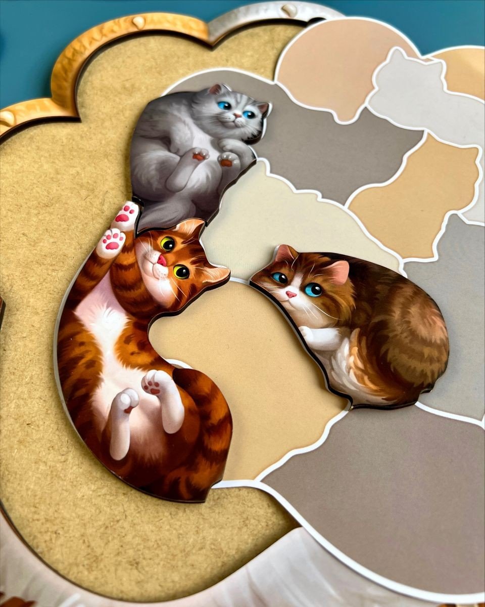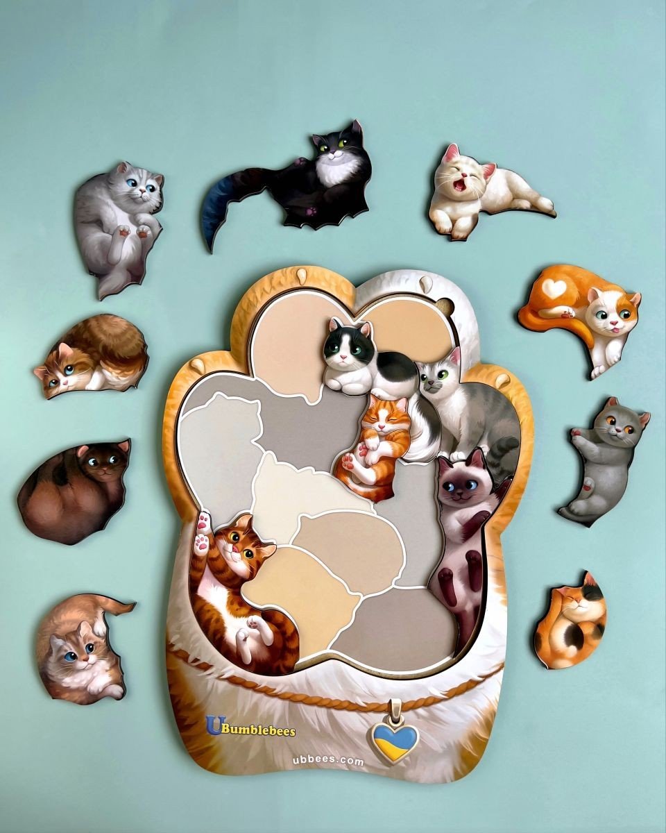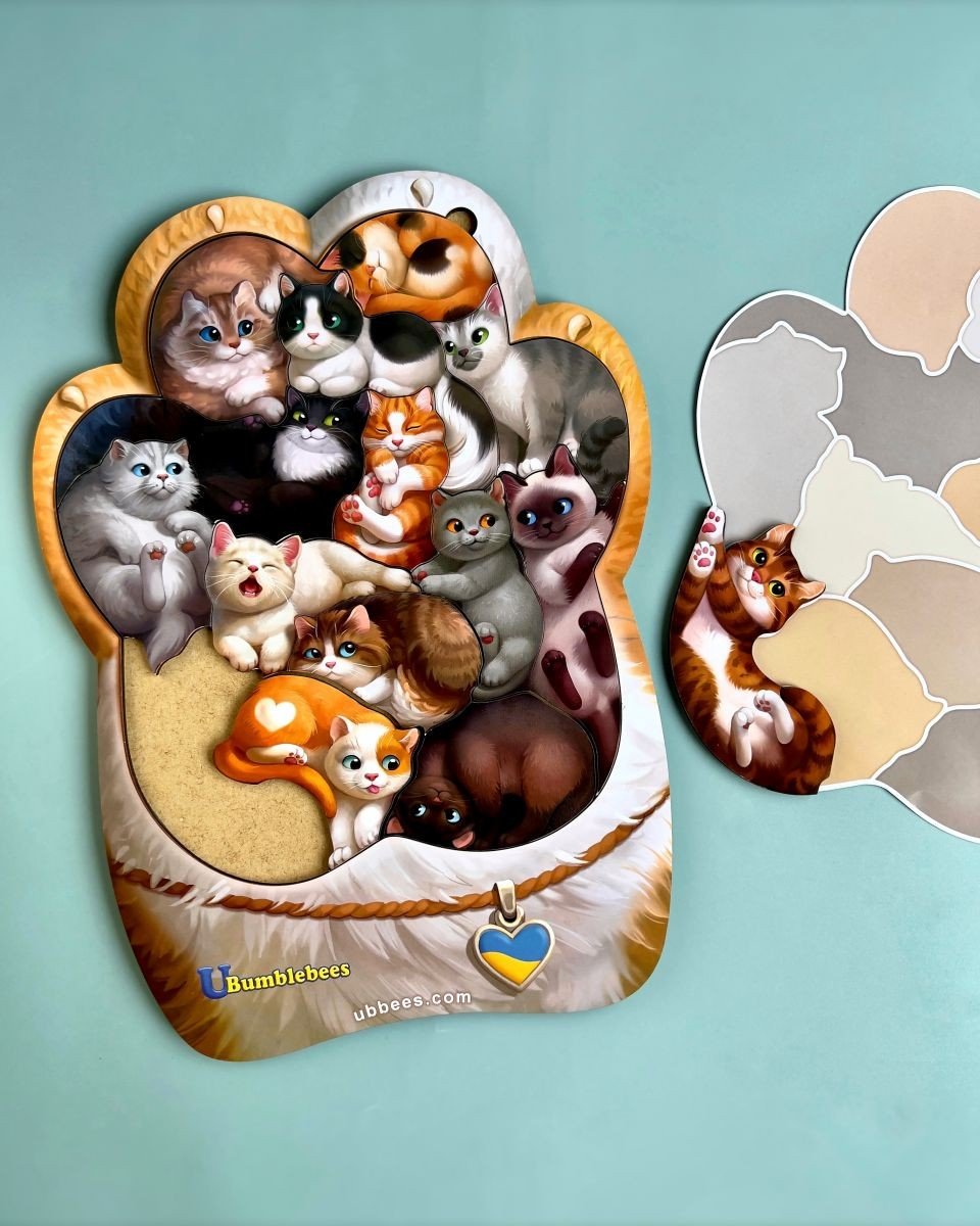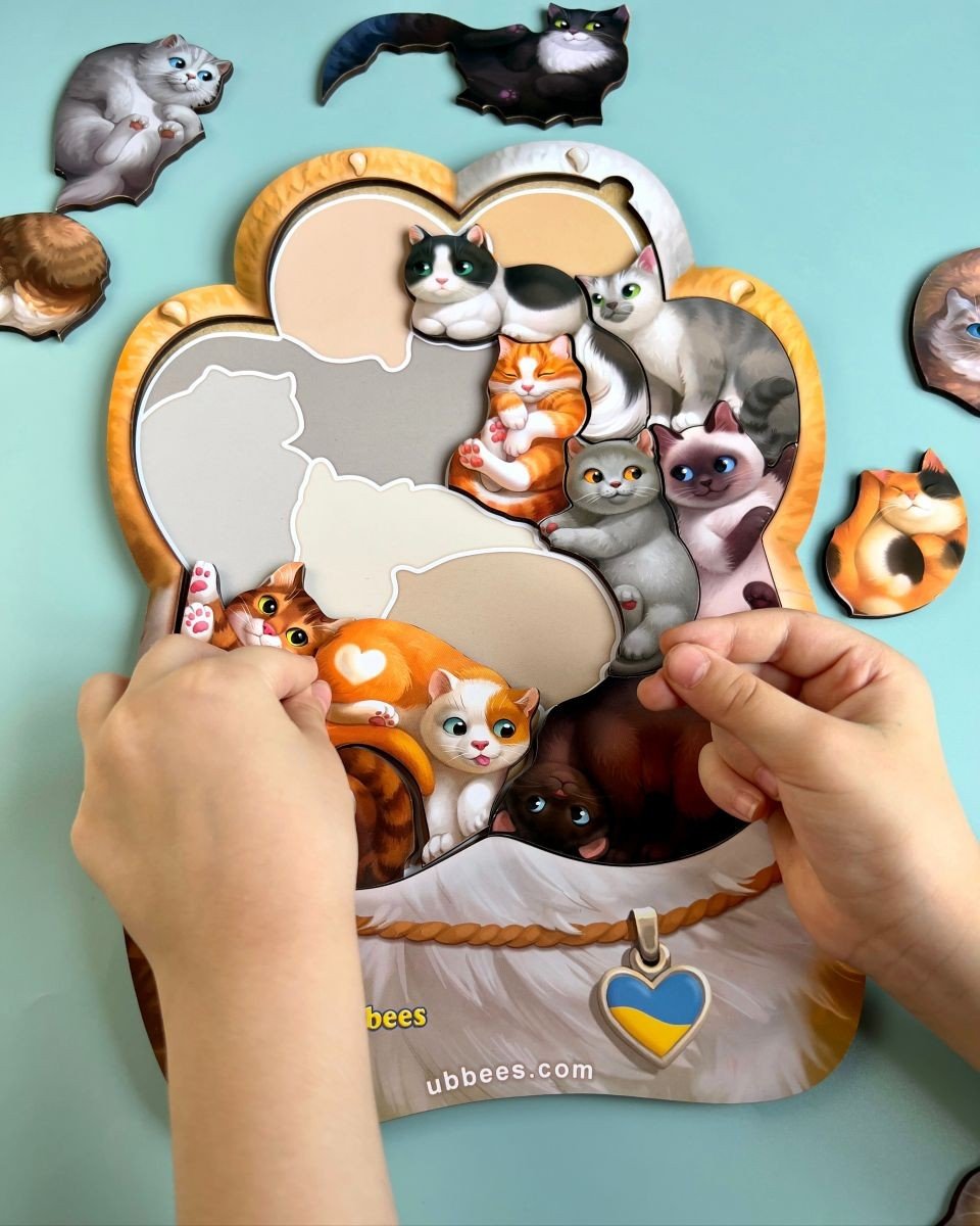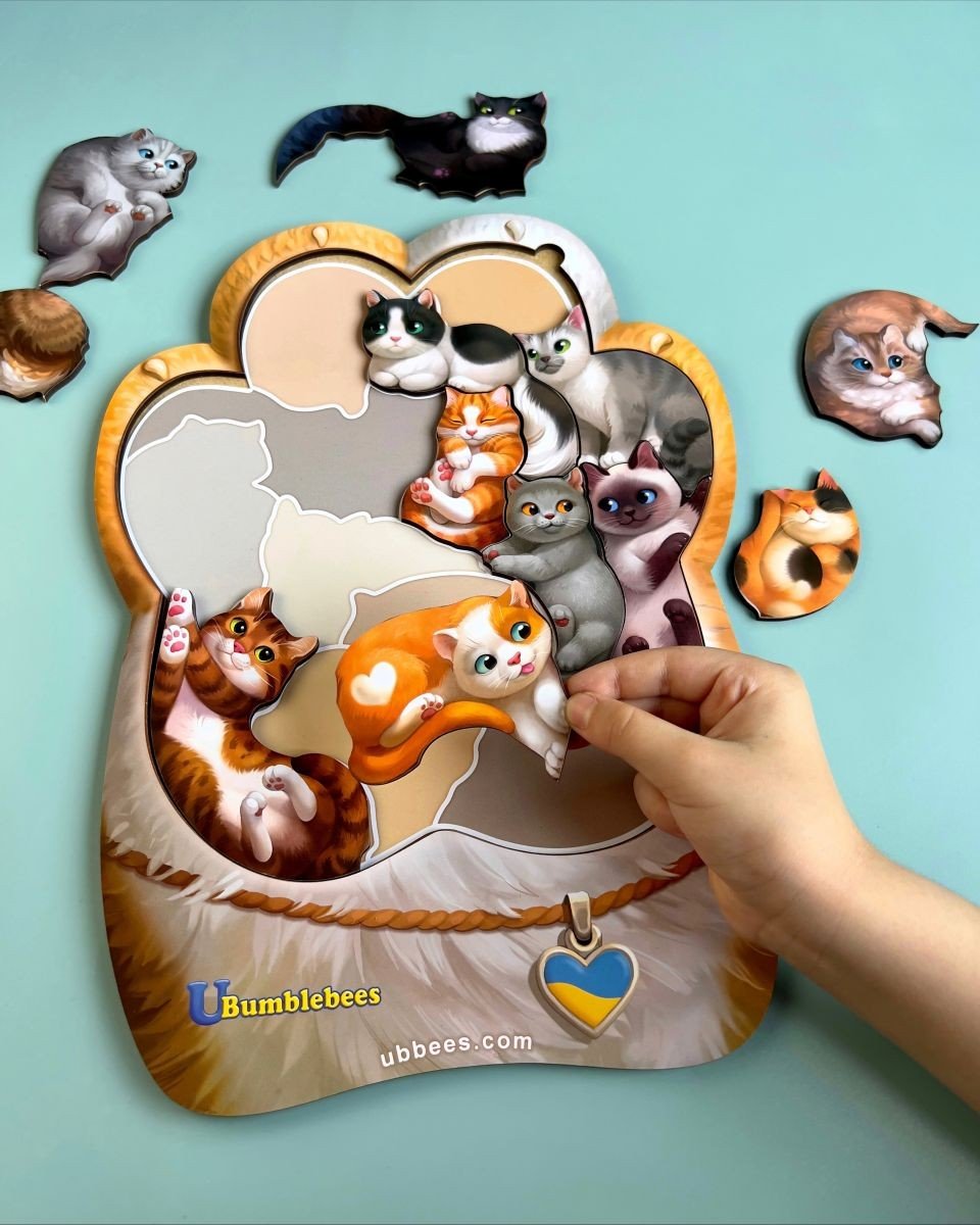 Пазл "Котики-муркотики" - 14 милих котиків розташованих на вкладиші у формі лапки. У наборі є вкладиш-підказка, щоб дитина могла по тіні шукати відповідного котика. Коли дитина навчиться, то ускладнити завдання можна знявши підказку.