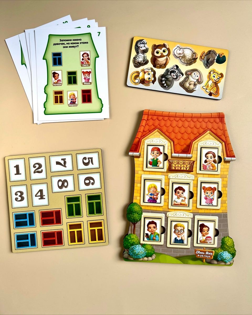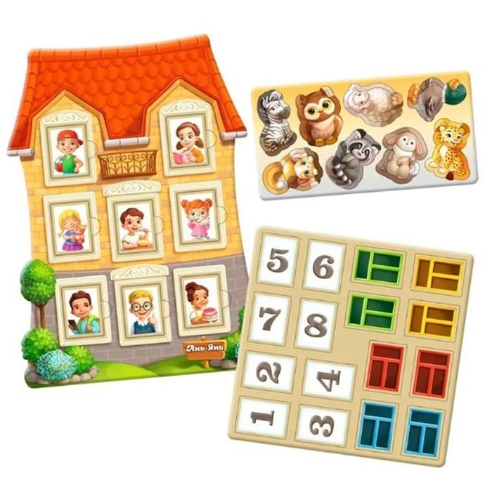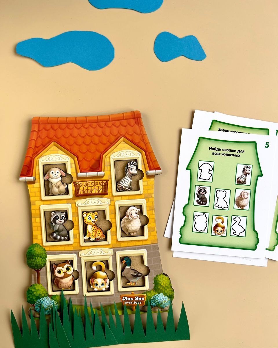 Пазл-сортер "Будиночок із завданнями" - у цьому будиночку зібрані ігри на різносторонній розвиток дитини. В ігровій формі розвиваємо зорову та слухову пам'ять, дізнаємося про домашніх та диких тваринок, тренуємо словник, рахуємо.