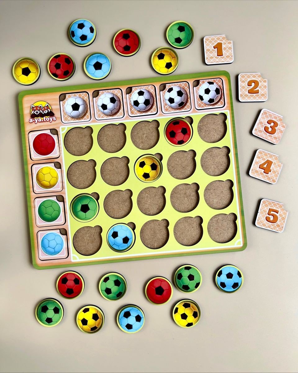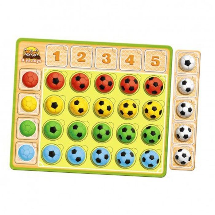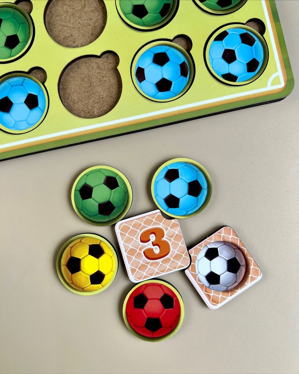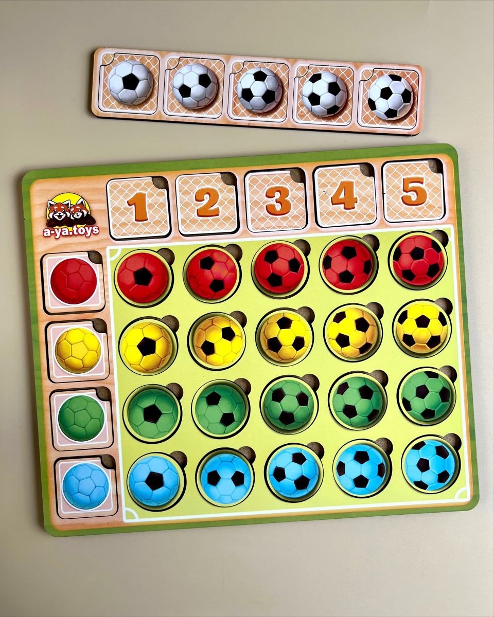 Пазл-сортер, у наборі 34 плашки для сортування. Під час гри дитині необхідно розташувати плашку із м'ячиком у потрібній графі. У вказаному кольорі та з потрібною кількістю чорних крапок на м'ячі або підібрати відповідну цифру від 1 до 5. Гра розвиває увагу, логіку та пам'ять.