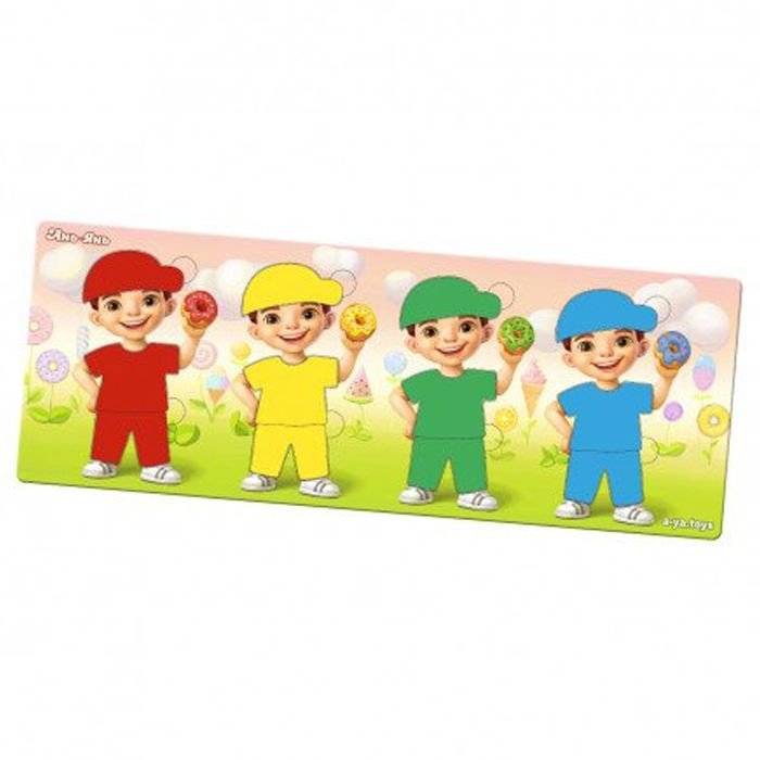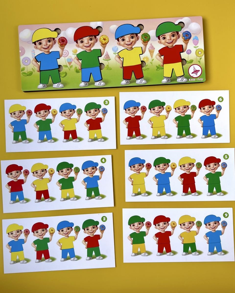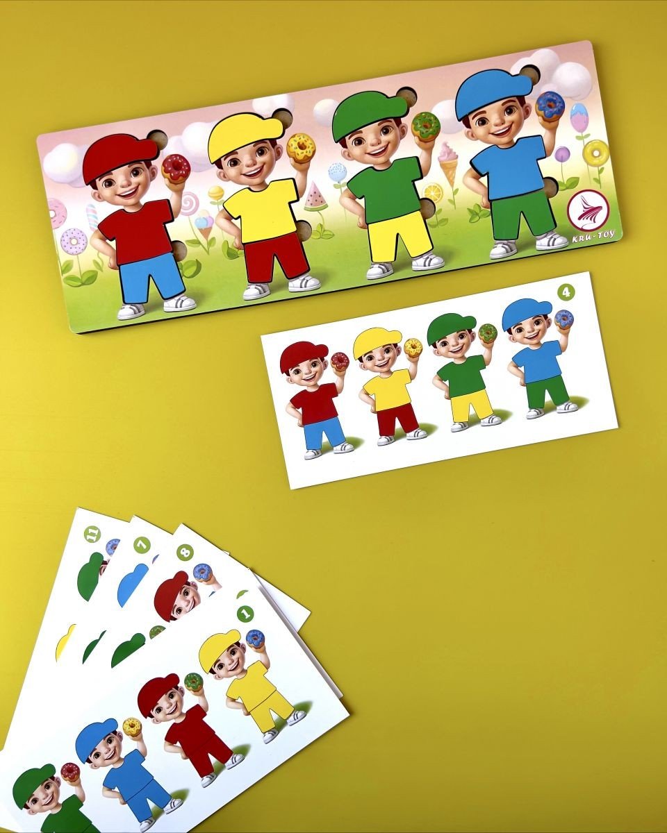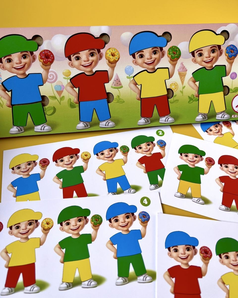 Пазл-сортер "Хлопчики з пончиками" - у наборі 12 деталей та 12 карток. Головне завдання дитини – одягнути всіх хлопчиків так, як зазначено на картці із завданням.