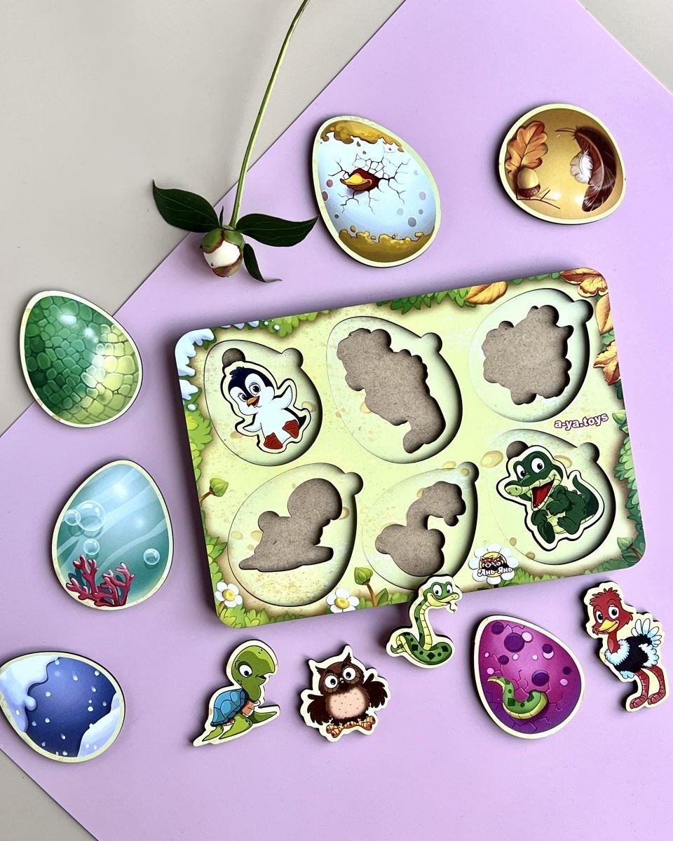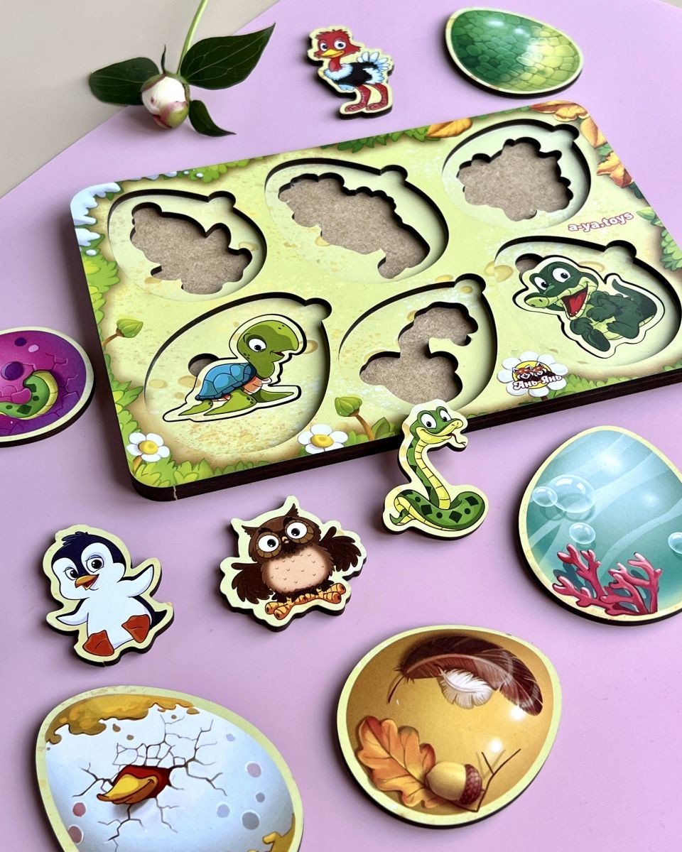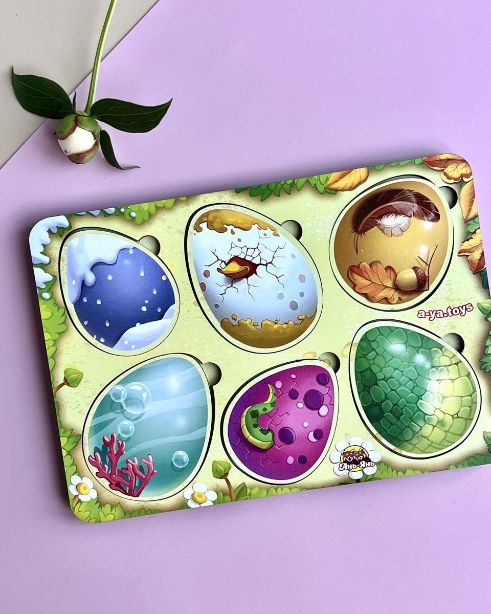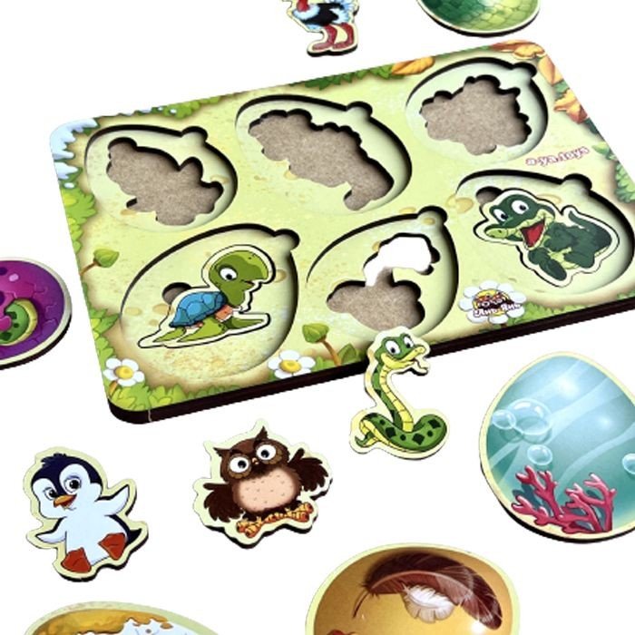 Дерев'яна рамка-пазл "Хто в яйці?" Нижній шар з картинками різних тварин та птахів, верхній – різнокольорові яйця. Вкладиш потрібно скласти за принципом пазла та встановити у рамці. Розмір рамки – 16х23 см.