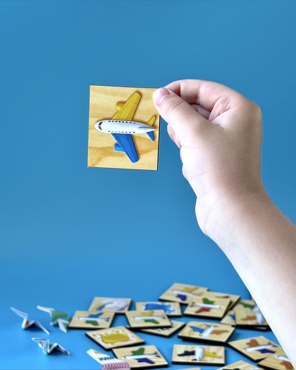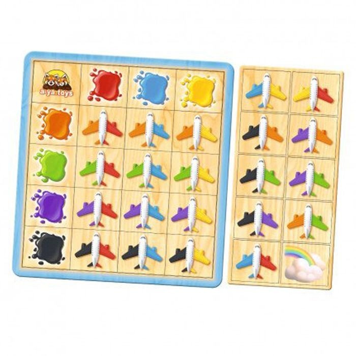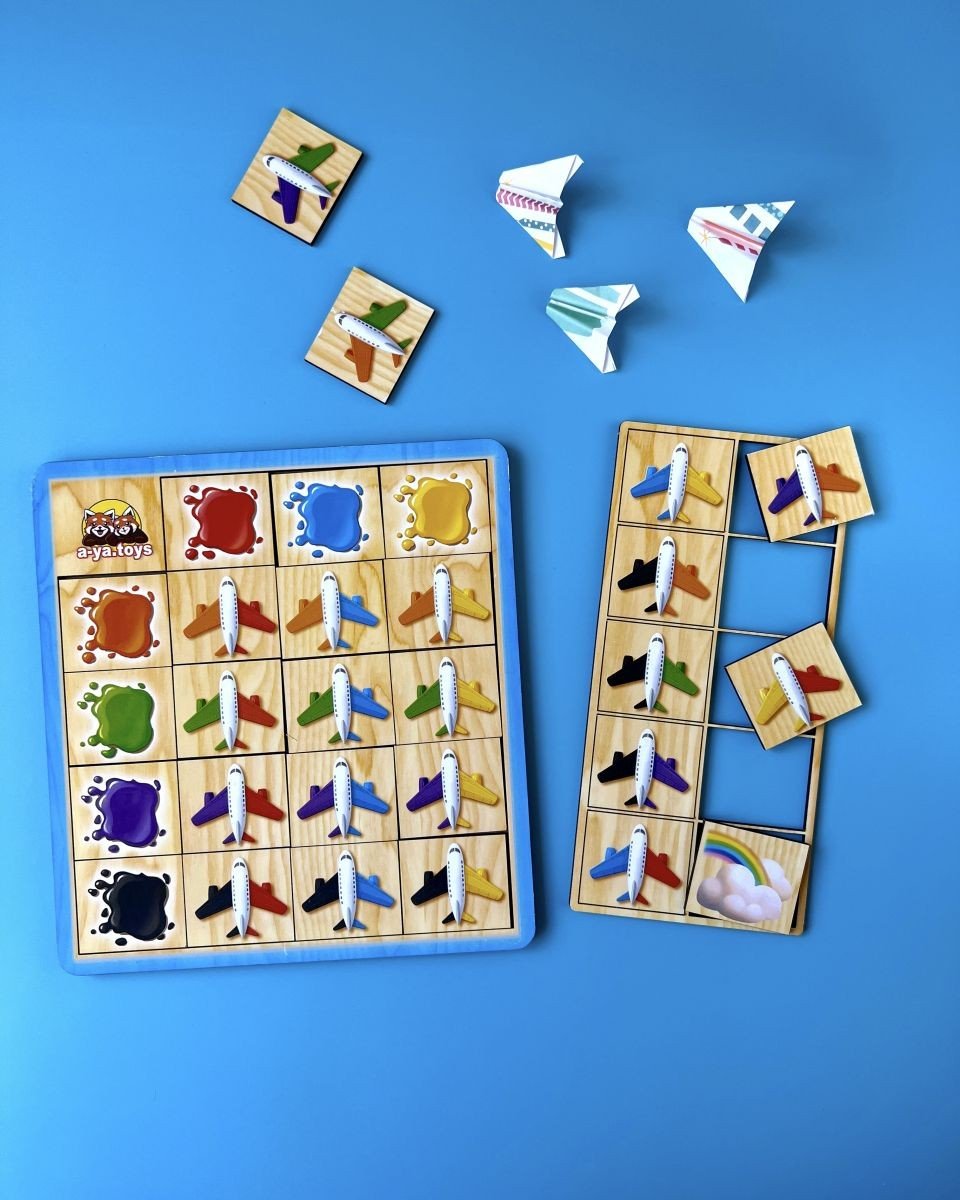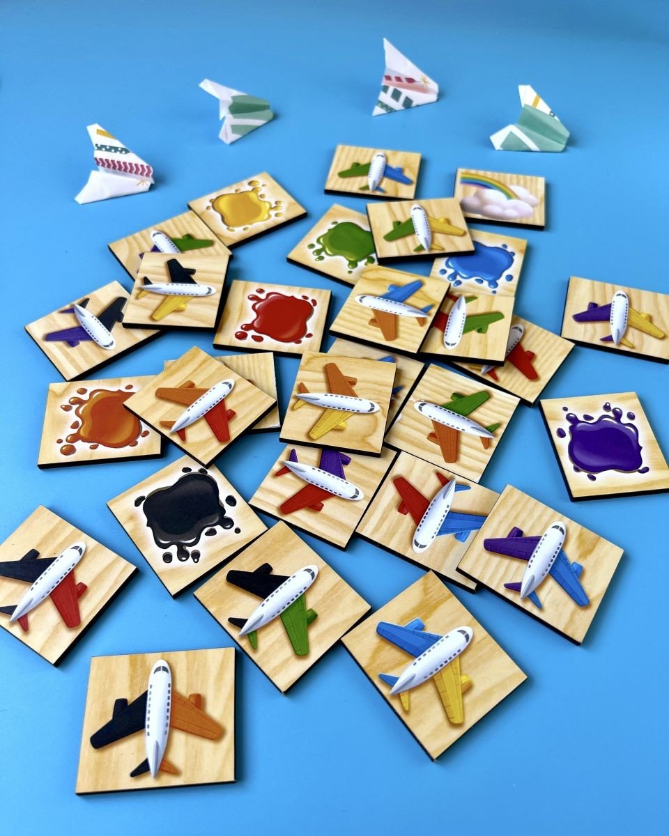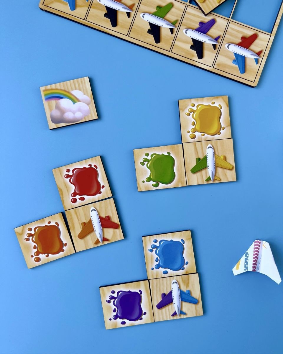 У наборі 30 плашок для сортування.Як грати: потрібно розташувати літаки згідно плашок з кольорами. Зліва і зверху знаходяться плашки, які відповідають за колір лівого та правого крила літака. Якщо малюк розташує кольори так, що не мож знайти потрібну плашку, значить літачок потрібно перевернути (вивчення напрямків). Якщо дитина все зрозуміє правильно, то вручаєте йому плашку з веселкою.