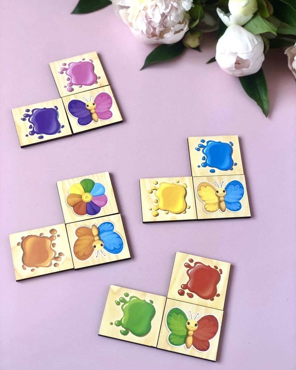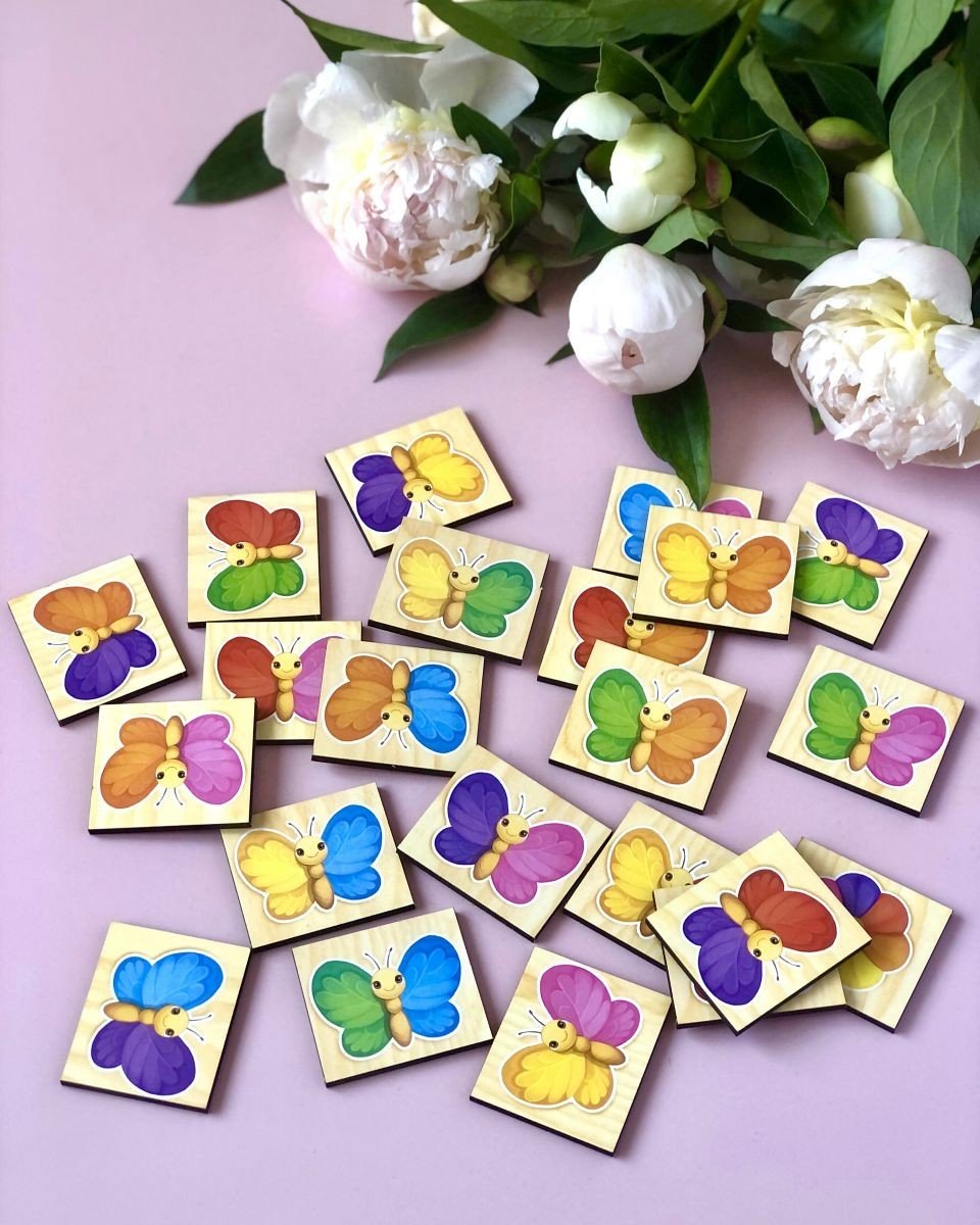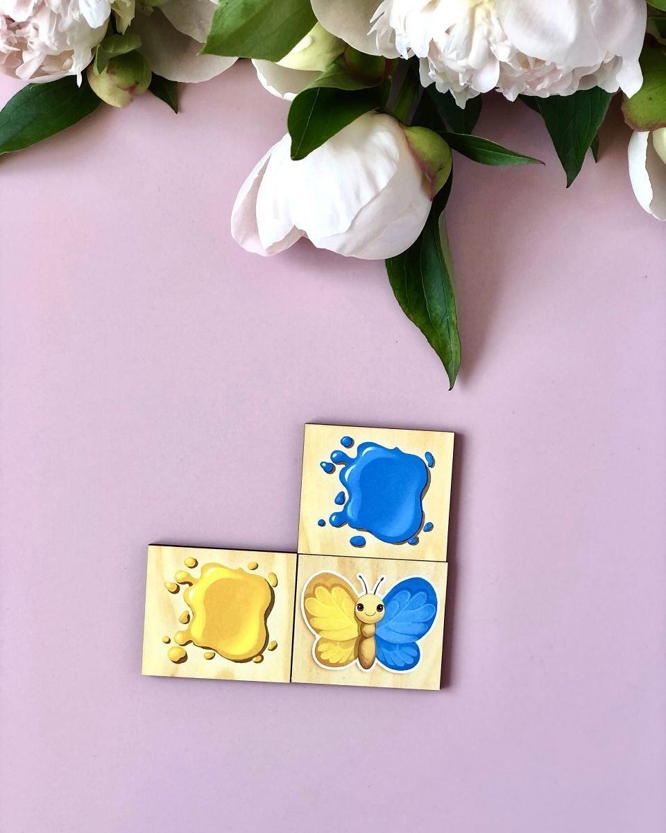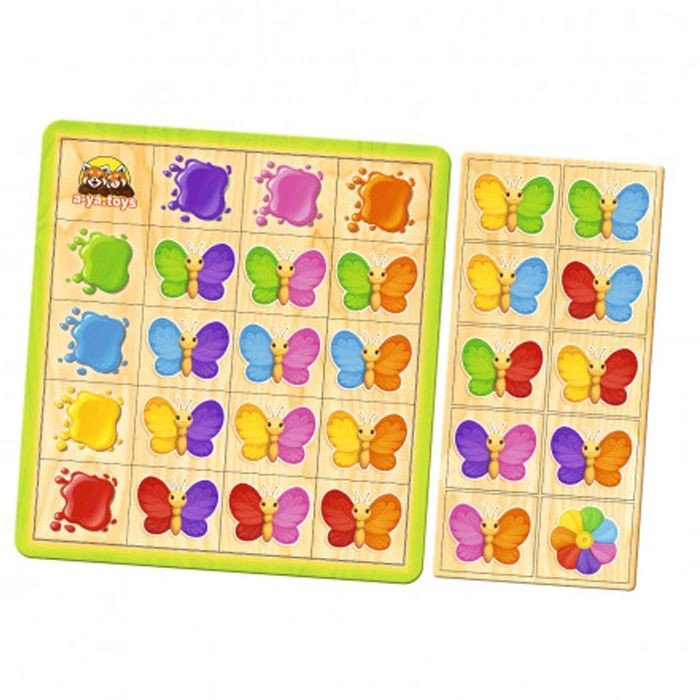 Пазл-сортер "Кольори" - у наборі 30 плашок для сортування. Дитині необхідно розташувати метеликів згідно плашок з кольорами. Зліва та зверху знаходяться плашки, які відповідають за колір лівого та правого крила метелика. Якщо малюк розташовує кольори так, що не може знайти потрібну плашку, значить метелика потрібно перевернути. Якщо дитина зробила усе правильно - отримає плашку із квіткою у винагороду.