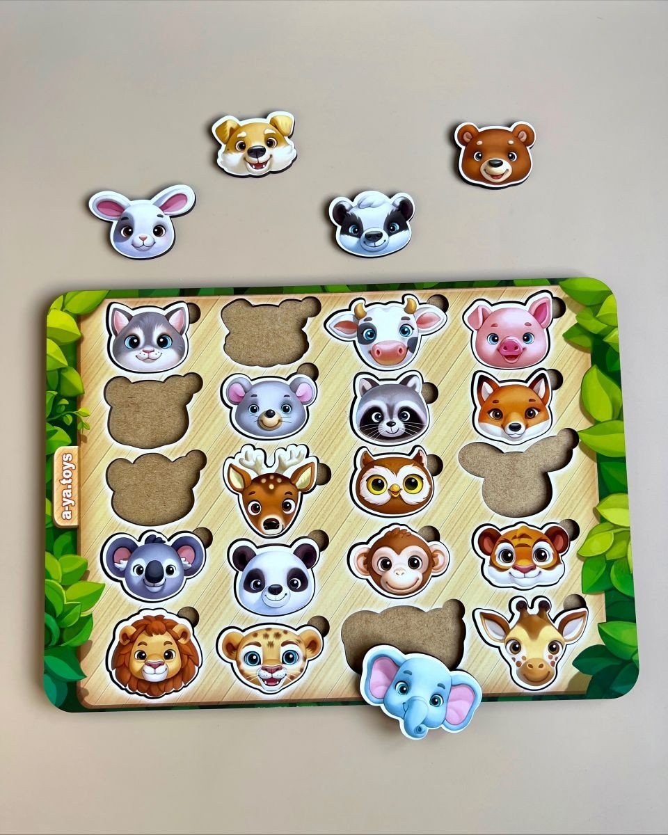 Пазл-сортер "Мордочки" - на планшеті знаходяться 20 милих мордочок різних тварин.Порахуйте звірів та поговоріть з дитиною про те, що вона знає про щит тваринок. Сортуйте тварин на диких та домашніх, великих і маленьких. Мордочки зручно діставати пальчиками і вкладати в основу за індивідуальною формою.