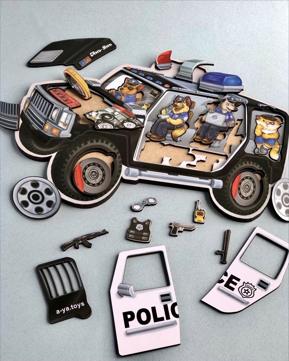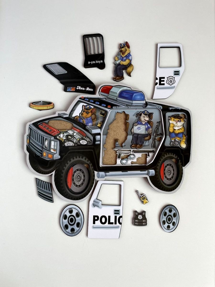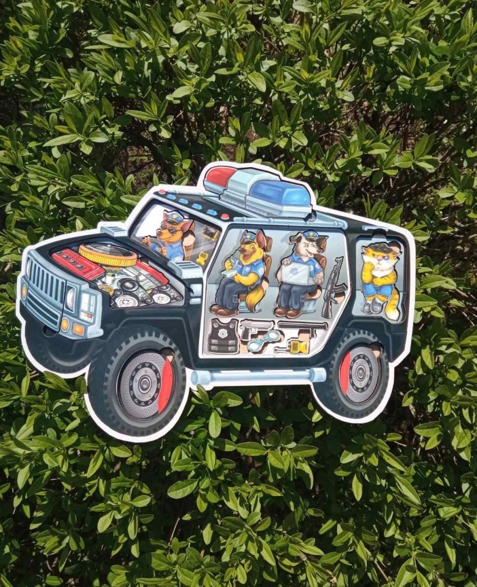 Двошарова гра вкладиш. У нижній шар потрібно укласти тварин, але в верхній шар – відповідні елементи автомобіля. Гра розвиває дрібну моторику, візуальне сприйняття та посидючість. Всі елементи зручно діставати пальчиками та укладати назад. Розмір сортера 32х23 см.