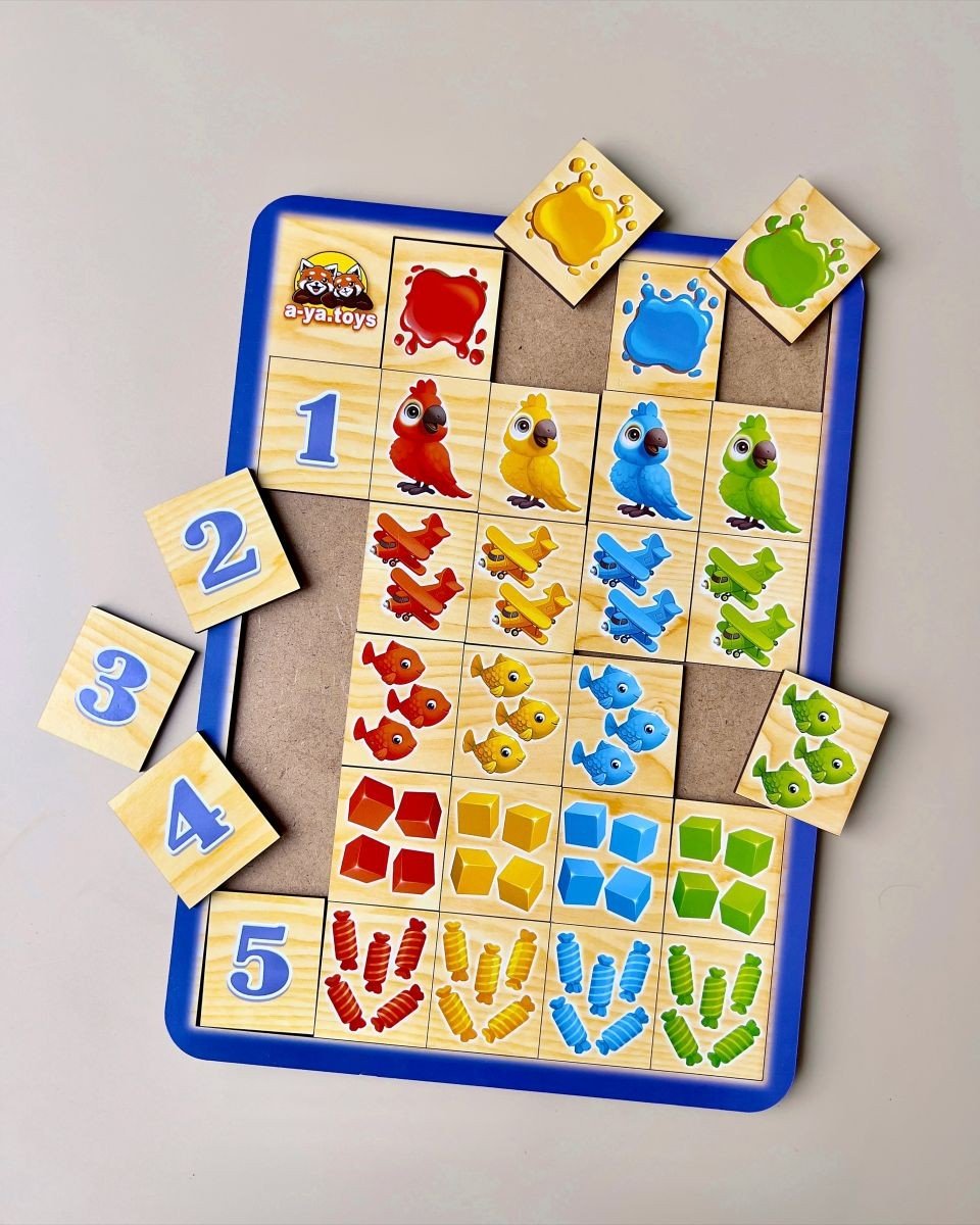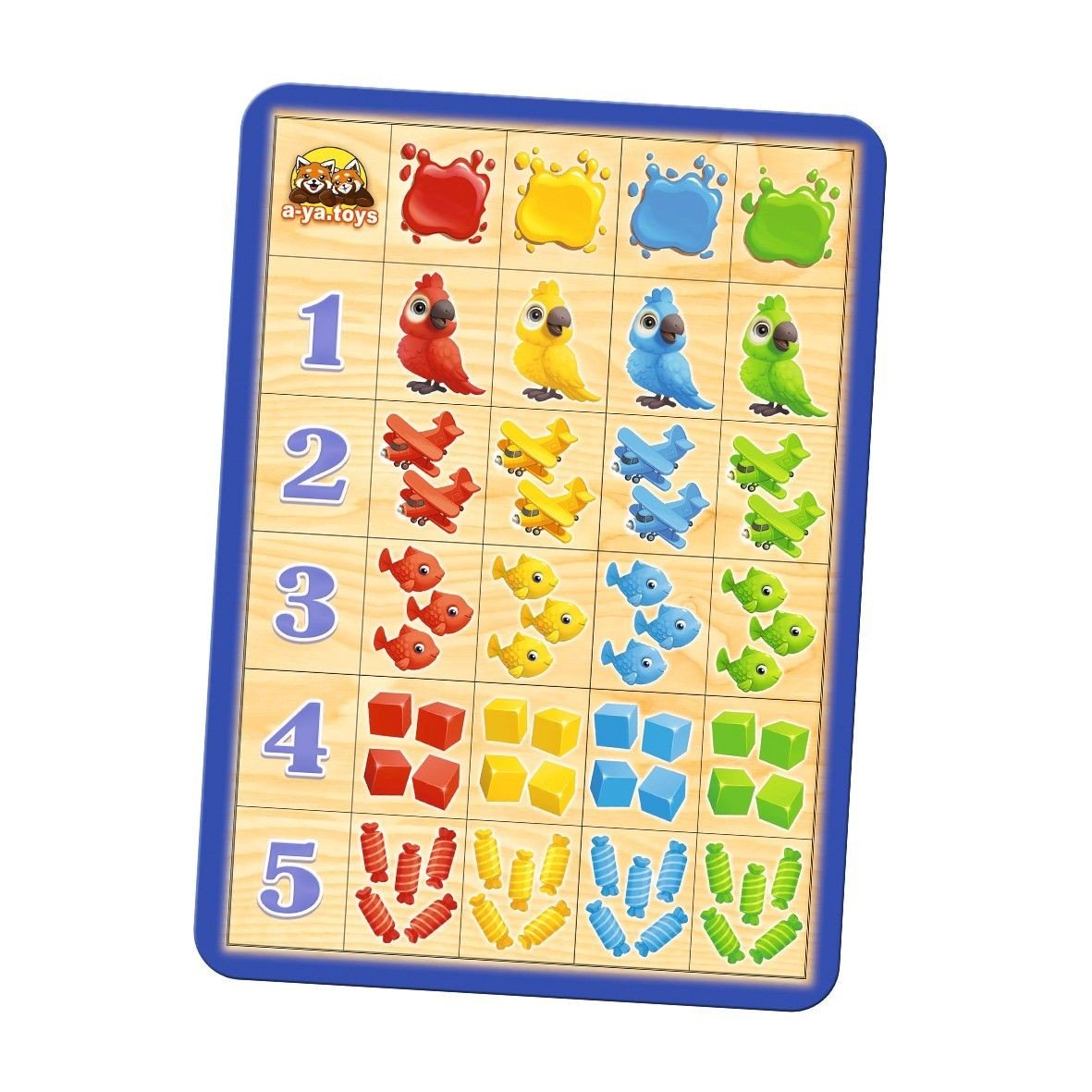 У наборі 29 плашок. Під час гри дитині необхідно розташувати плажку з малюнком у потрібній графі - зазначеному кольорі та з правильною кількістю героїв (плажкаи з цифрами від 1 до 5 та плажки з кольорами). Гра розвиває увагу, логіку, мислення та пам'ять. Допоможе дитині у вивченні цифр. Розмір сортера 32х23 см.