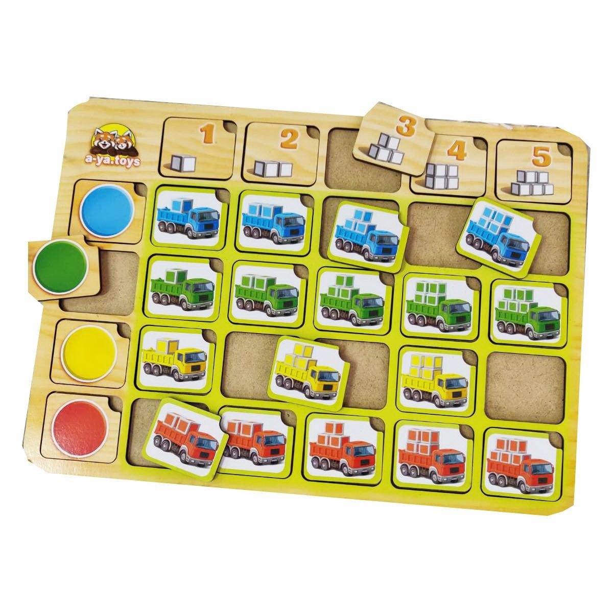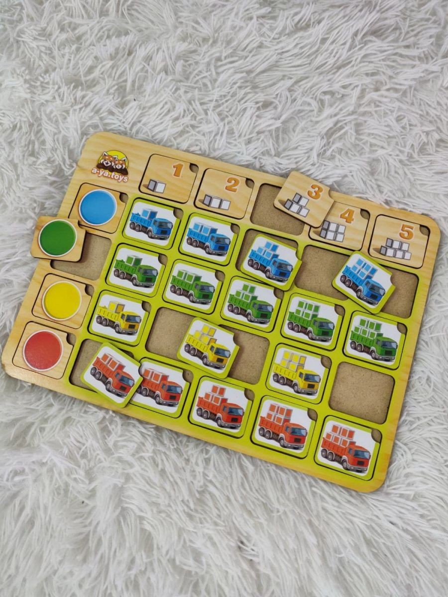 Пазл-сортер"Вантажівки: Колір та рахунок" - у наборі ліворуч зображені 4 плашки, які відповідають за колір, а зверху 5 плашок з різною кількістю кубиків для вивчення рахунку від 1 до 5. Завдання дитини: розташувати плашку з вантажівкою у потрібній графі, у зазначеному кольорі та з необхідною кількістю кубиків у кузові. Гра спрямована на розвиток дрібної моторики, логіки, просторової орієнтації.