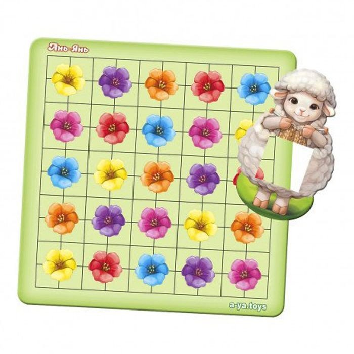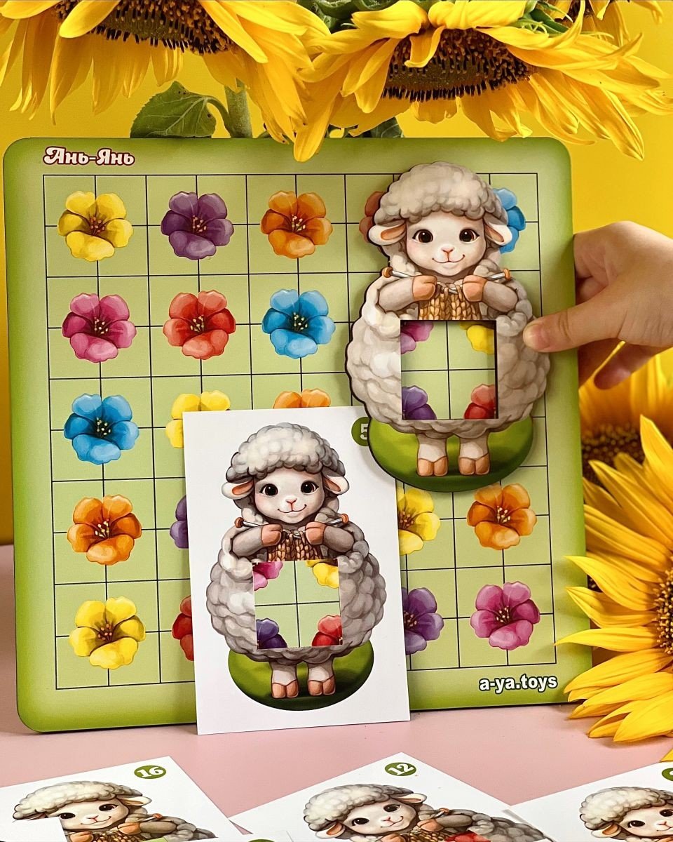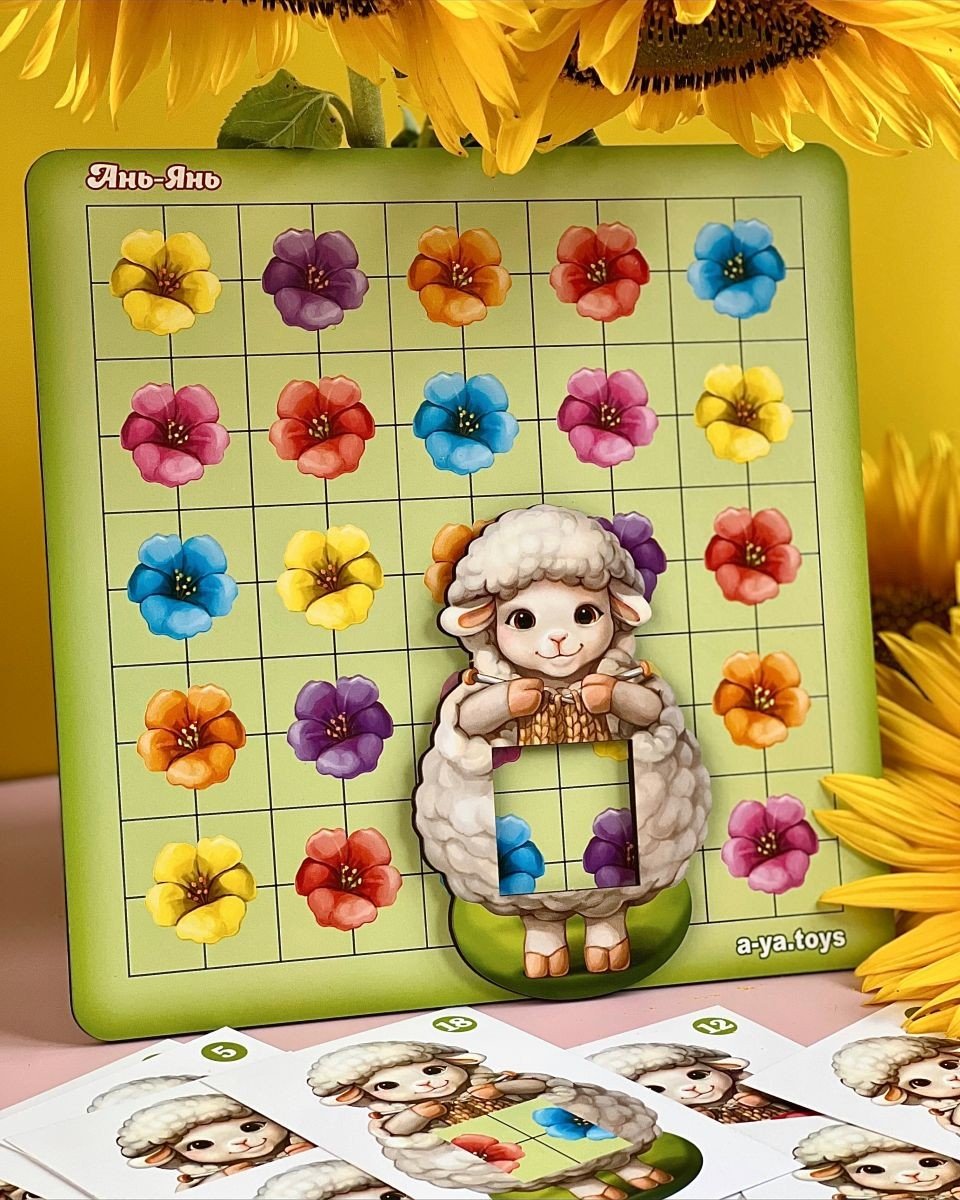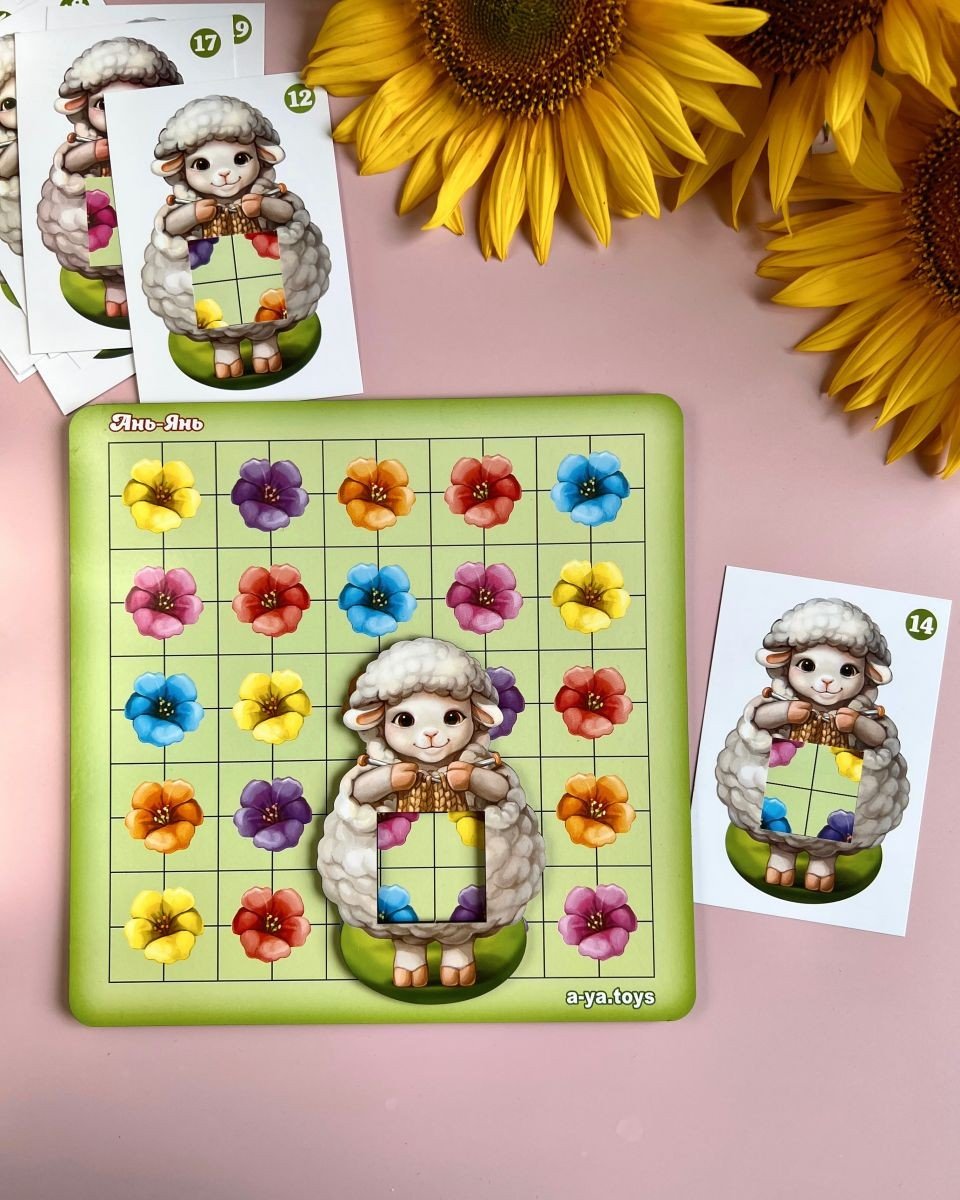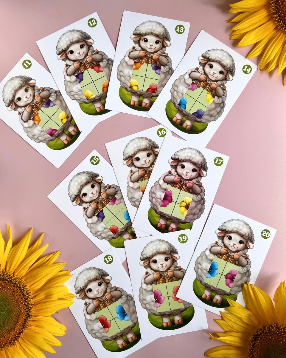 У наборі ігрове поле, вівця та 20 карток. Деталі у вигляді квадратів. Завдання малюка: за допомогою овечки знайти фрагменти квіточок, які позначені на картці. Можна вважати квіточки та вивчати кольори.