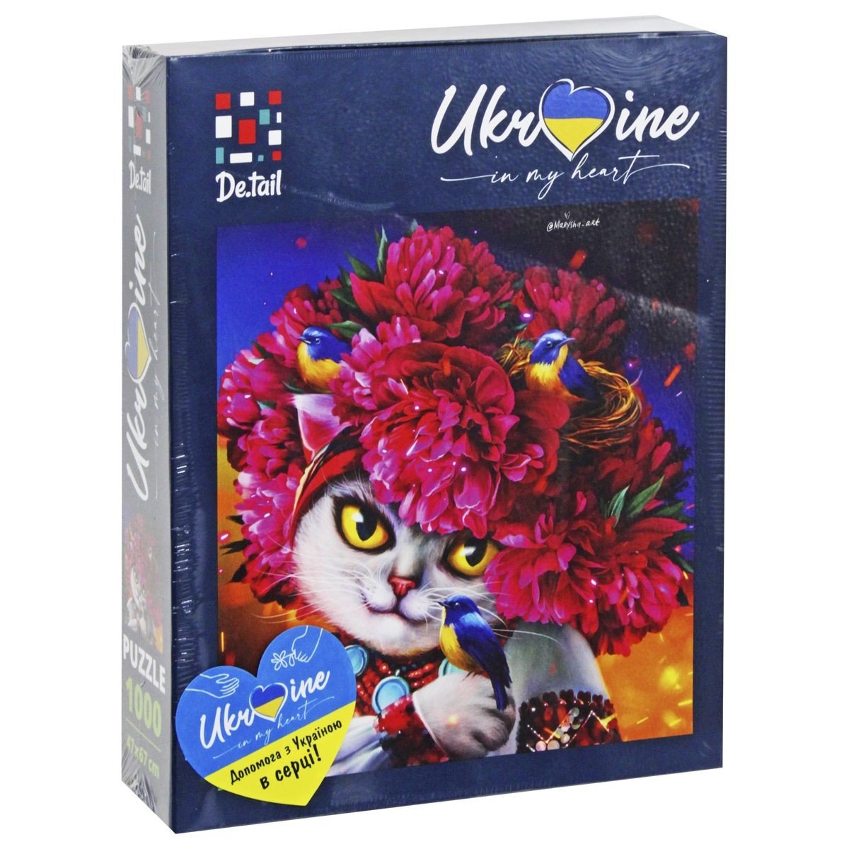 Красивий пазл з зображенням робіт української художниці Маріанни Пащук. Картонний, на 1000 елементів. Розмір картинки: 47х67 см. У комплекті також є текстильний мішечок для зберігання деталей пазлу, листівка та костер (підставка під чашку). Укомплектовано все в яскраву картонну коробку.
