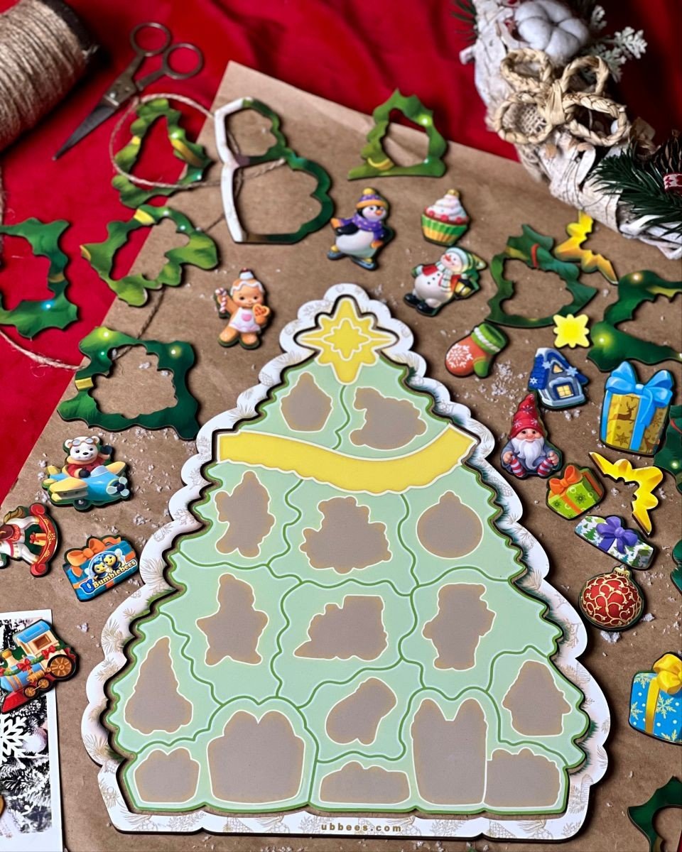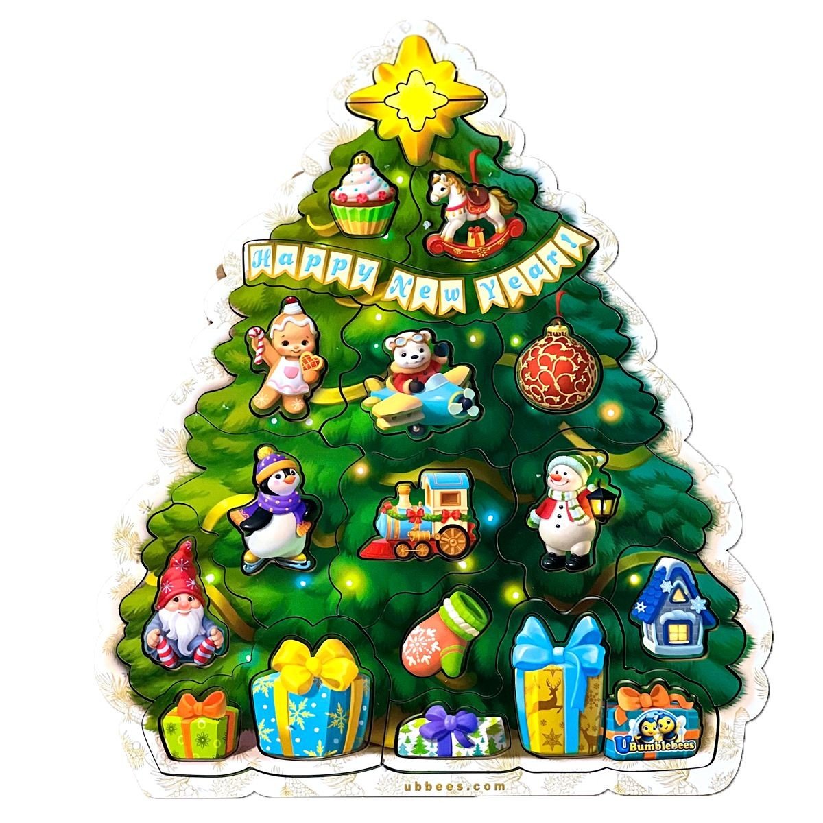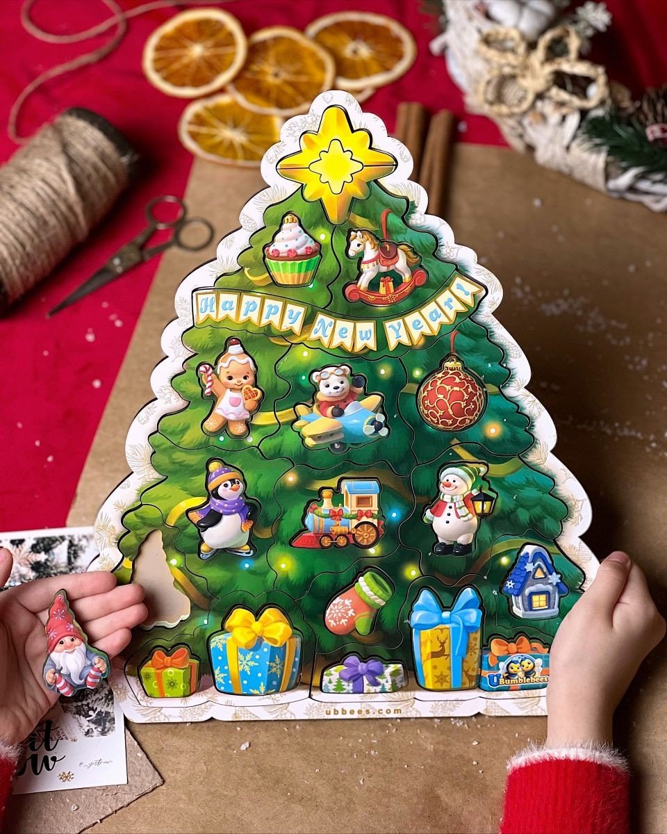 Пазл з підказкою "Новорічна ялинка". Дитині потрібно не лише вставити деталі в рамки, а й правильно розкласти самі рамки у вигляді ялинки. Гра для розвитку зорової пам'яті, дрібної моторики, логічного мислення. Дитина дізнається більше про свято Нового Року, його символи та традиції. В комплекті 33 деталі. Виготовлено з якісних та безпечних матеріалів.