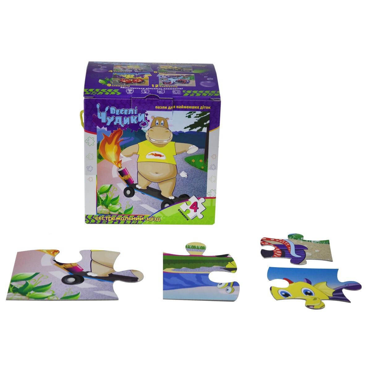 Пазли 4 в 1 "Веселі чудики". У набір входять 4 пазла для самих маленьких, на 4,6, 9 і 12 деталей. У готовому вигляді все картинки мають розмір 25 х 25 см, у пазлів відрізняються розміри деталей. Розвивають логічне мислення, дрібну моторику рук, посидючість.
