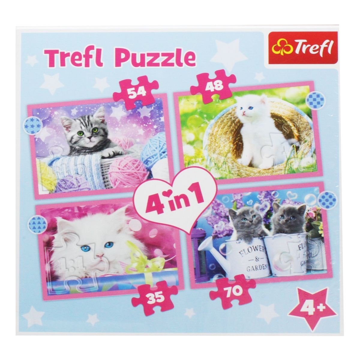 Яскраві та барвисті пазли 4в1з милими картинками котиків. У наборі є 4 картинки на різну кількість деталей – на 54, 48, 35 та 70 елементів. Розмір готової картинки 20х28, 5 см. Пазли різного розміру. Розвивають логічне мислення, дрібну моторику рук, усидливість. Набір виконаний із якісних та безпечних матеріалів. Для дітей віком від 4-х років.