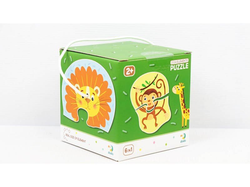 6 яскравих пазлів із зображеннями тварин, які складаються з 2-х, 3-х або 4-х елементів. Детальки великі і яскраві. Гра з пазлами допоможе малюкові вивчити різні види тварин, розвинути посидючість, увагу і дрібну моторику.