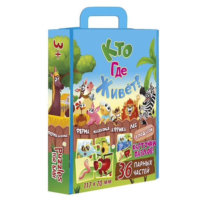 Пазли дитячі "Хто де живе?" познайомлять малюка з мешканцями ферми і ліси, тваринами Африки і комахами. Дитині потрібно буде до пазлу на якому зображені тварини, підібрати їх будиночок. Картки в подарунок.