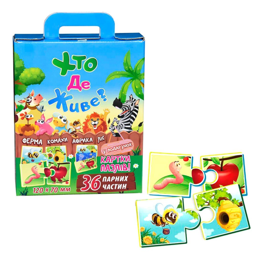 Пазли дитячі "Хто де живе?" познайомлять малюка з мешканцями ферми і ліси, тваринами Африки і комахами. Дитині потрібно буде до пазлу на якому зображені тварини, підібрати їх будиночок. Картки в подарунок.