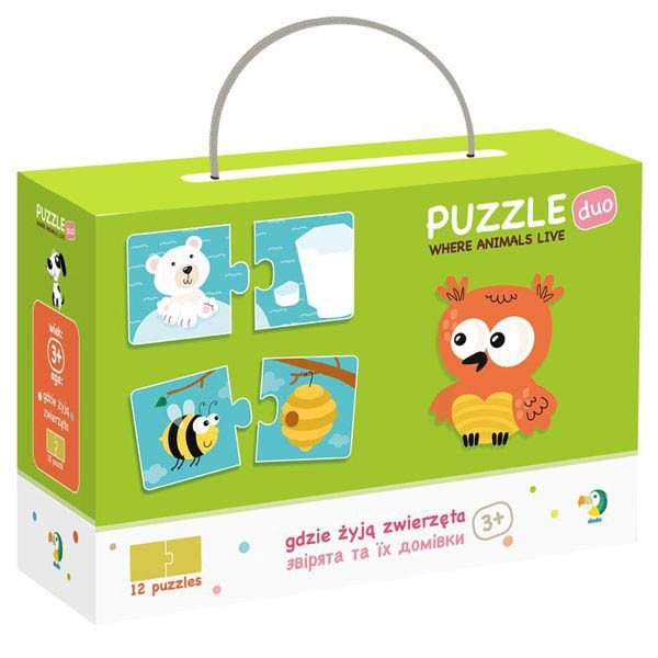 Яскраві розвиваючі пазли-гра "Тварини і їх будиночки". Малюкові потрібно правильно з'єднати пазли, що складаються з 2-х елементів (тварина і його будиночок). Всього потрібно зібрати 12 пар. У комплекті: 24 деталі. Розмір детальки: 6,5х 6,5 см.